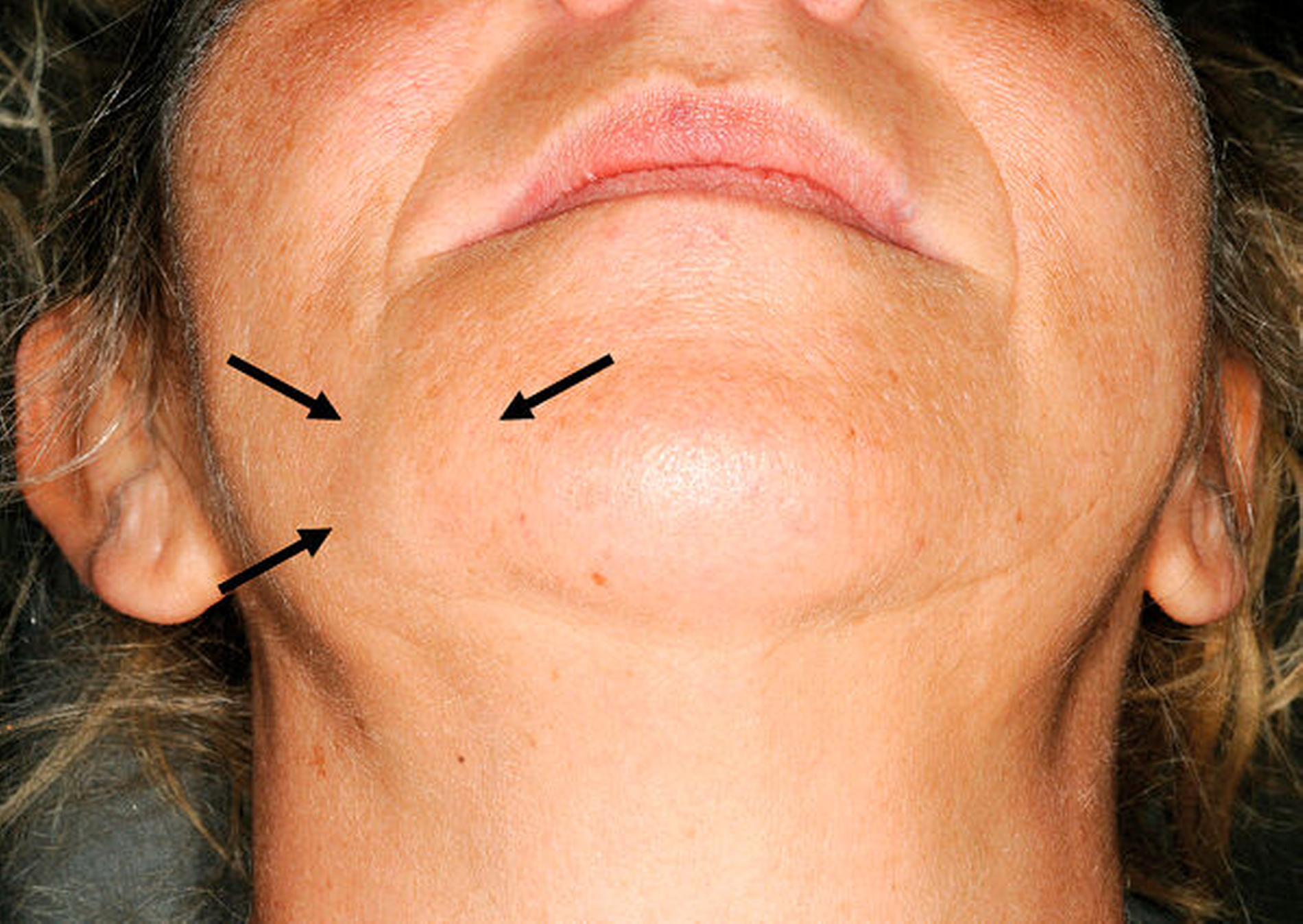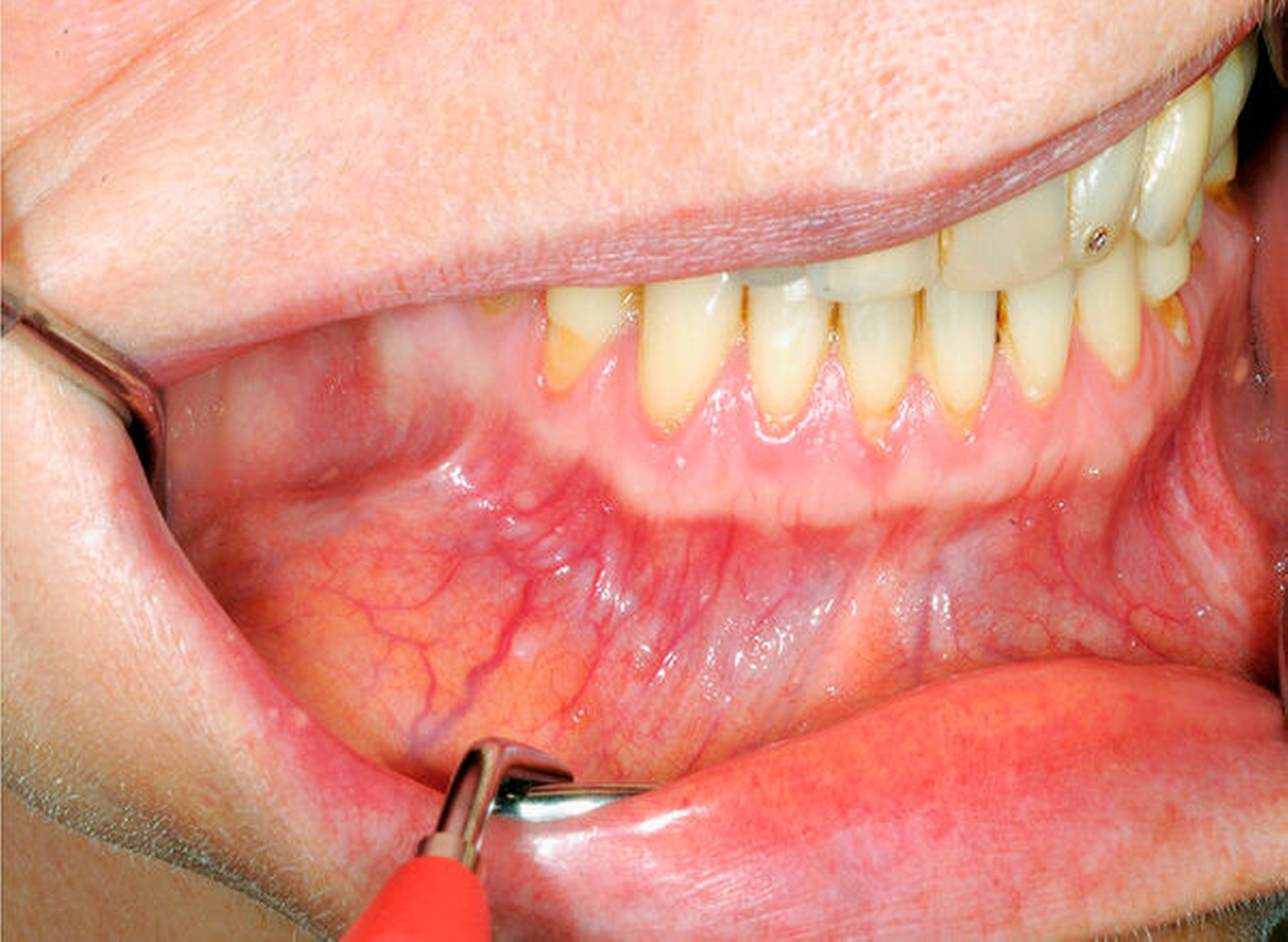 Die extraorale Untersuchung ergab eine dezente Schwellung paramandibulär rechts (Abbildung 2). Enoral war eine umschriebene, prallelastische, schmerzlose Auftreibung des Corpus mandibulae vestibulär regio 43 bis 46 zu verzeichnen, ohne akute Entzündungszeichen (Abbildung 3) bei ansonsten unauffälligem Schleimhautbefund und weitestgehend saniertem Zahnstatus. Hinweise auf eine Fraktur des Unterkiefers oder Hypästhesien ergaben sich nicht.