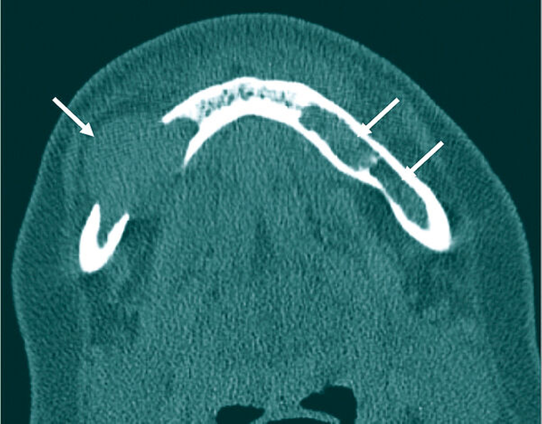 Zur Stabilisierung der Halswirbelfraktur erfolgte zeitnah eine Radiatio. Über die hochgradige Frakturgefahr des Unterkiefers wurde die Patientin eingehend aufgeklärt und eine Ernährung mit ausschließlich flüssig-weicher Kost vereinbart. Eine mandibulomaxilläre Ruhigstellung wurde vorbehalten. Bei den regelmäßigen Nachkontrollen ergab sich sechs Monate nach Therapieeinleitung ein insgesamt stabilisierter Unterkiefer ohne Anhalt für eine Fraktur.