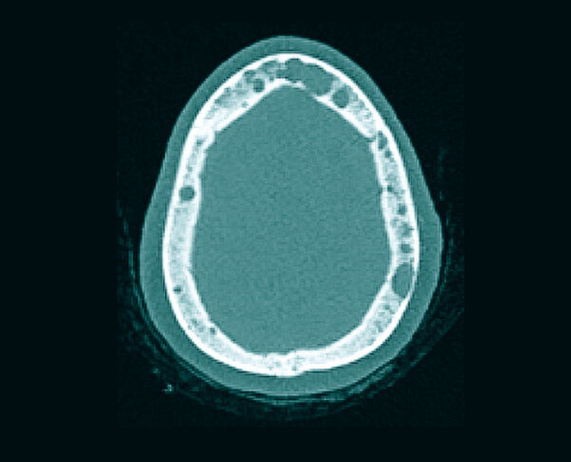Das Orthopantomogramm zeigte eine auffällige, homogene, scharf begrenzte osteolytische Veränderung in regio 43 bis 46 ohne Resorption der angrenzenden Zahnwurzeln, allerdings mit Destruktion der Corpusunterkante korrespondierend zur klinisch evidenten Auftreibung des Unterkiefers. Daneben waren weitere osteolytische Läsionen zu verzeichnen, die sich subtotal über die gesamte Mandibula verteilten (Abbildung 1). Die Computertomografie des Unterkiefers bestätigte das Vorliegen multipler disseminierter osteolytischer Prozesse (Abbildung 4).