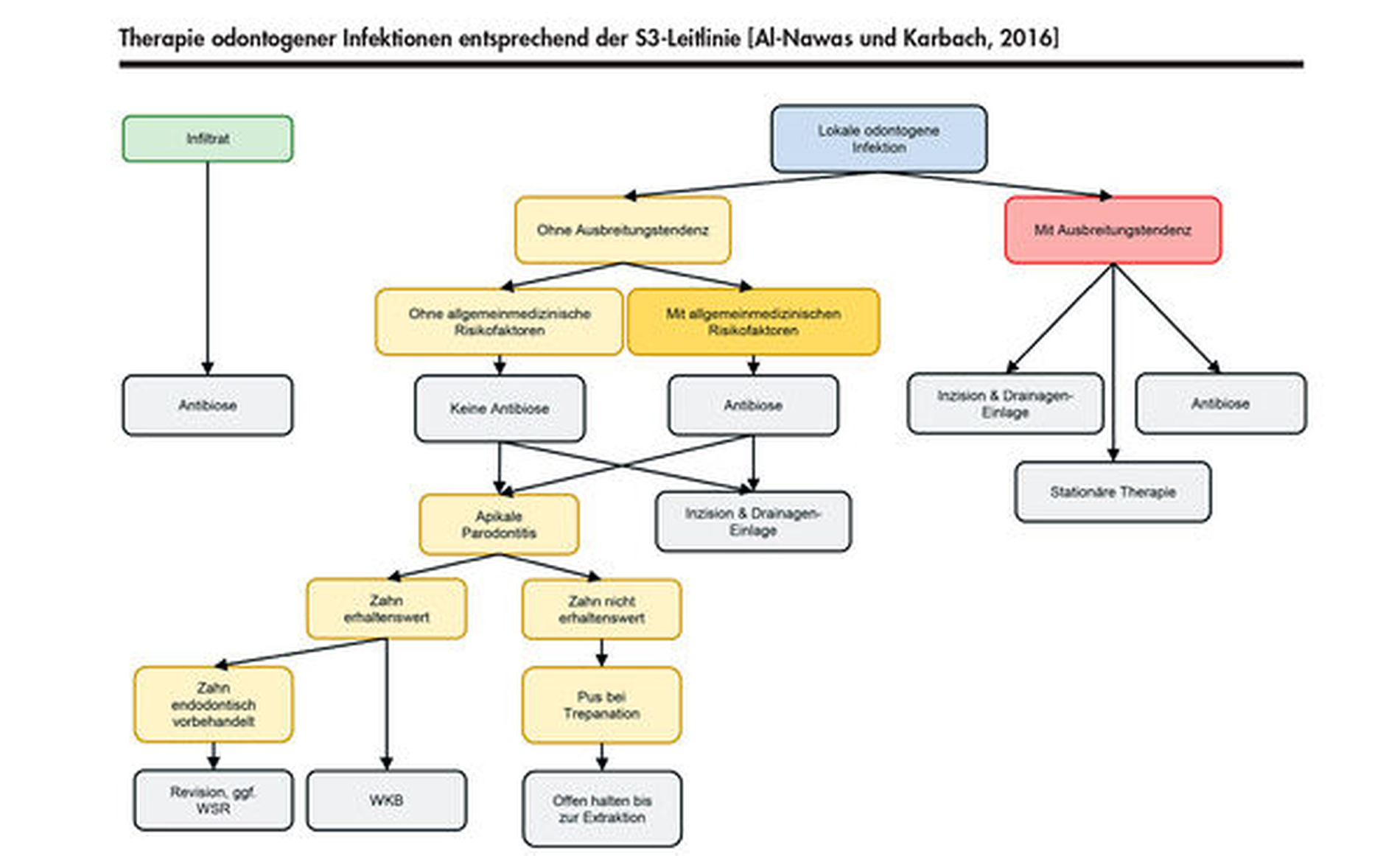 Die Therapie eitriger odontogener Infektionen besteht in der chirurgischen Eröffnung der Abszesshöhle und einer anschließenden Drainage. Bei Vorliegen von Risikofaktoren oder einer Ausbreitungstendenz sollten außerdem systemische Antibiotika, vorzugsweise Penicillin oder Aminopenicilline, gegebenenfalls auch in Kombination mit Betalaktamasehemmern Anwendung finden.