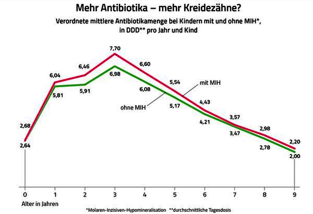 Bezüglich der Ätiologie konnte die langjährige Vermutung, dass Antibiotika eine MIH begünstigen, durch die Versicherungsdaten der Barmer bestätigt werden. Demzufolge besteht eine Korrelation zwischen den Antibiotikaverordnungen in den ersten vier Lebensjahren und MIH. Dabei wurden Kindern mit Kreidezähnen gängige Antibiotika bis zu zehn Prozent häufiger verschrieben als anderen Kindern ihrer Altersgruppe, darunter Penicilline sowie Beta-Lactam-Antibiotika. Seltener eingesetzte Präparate zeigten sogar Korrelationen von bis zu 30 Prozent – zu dieser Gruppe zählen zum Beispiel Sulfonamide und Nitrofurane.