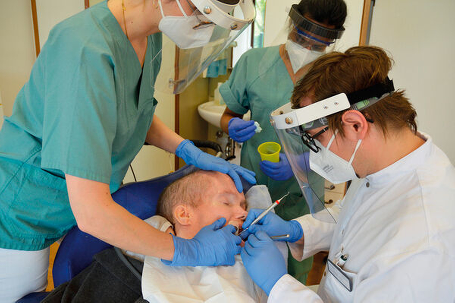 Die evangelische Stiftung ist in unterschiedliche Bereiche aufgeteilt. Aktuell betreuen wir zwei Häuser, die zur Spezialpflege gehören. Hier leben Menschen mit schweren Behinderungen, die oft nicht mobil sind. Daher macht es Sinn, vor Ort zahnmedizinische Behandlungen anzubieten. Aufgrund der freien Arztwahl werden nicht alle Bewohnerinnen und Bewohner von uns betreut, aber die Mehrheit. Insgesamt nehmen etwa 100 Personen unser Behandlungsangebot an.