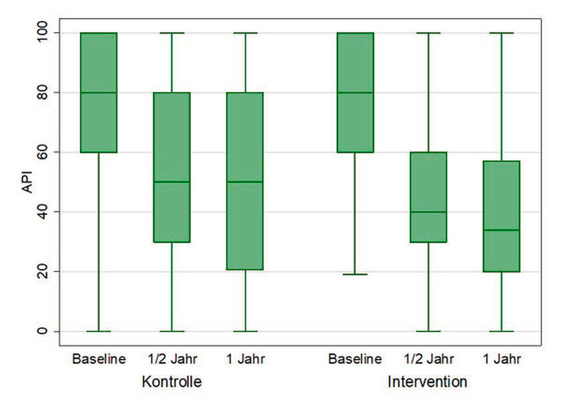 Bei den Probanden der Interventions- und der Kontrollgruppe konnte über den gesamten Untersuchungszeitraum eine kontinuierliche Verbesserung der Mundhygiene über den Plaqueindex API festgestellt werden (Abbildung 2). In der Interventionsgruppe konnte dies schon bei den beiden zusätzlichen Präventionsimpulsen um die Narkose herum, die die Kontrollgruppe nicht erhielt, beobachtet werden.
