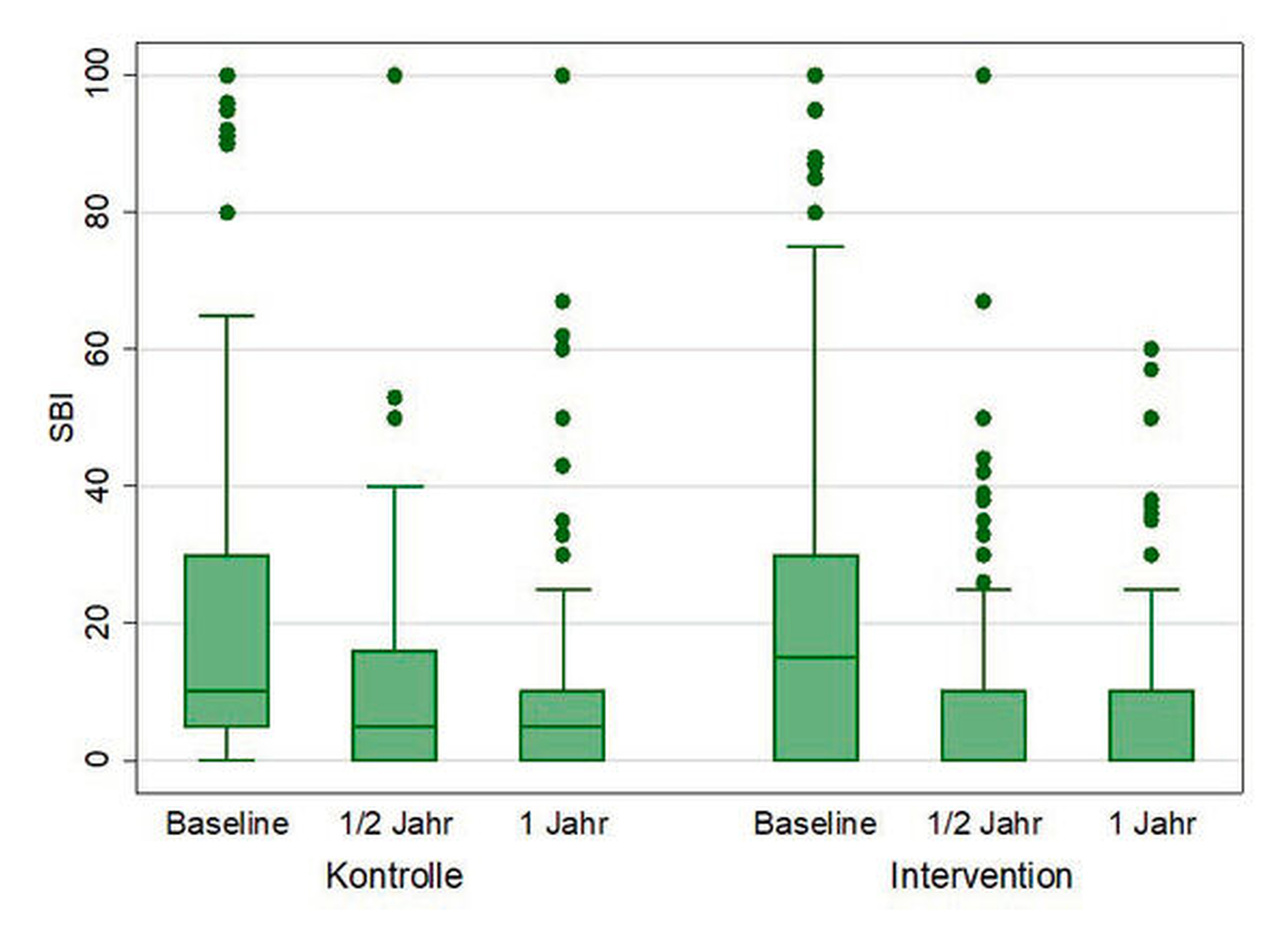 Bei den Probanden der Interventions- und der Kontrollgruppe konnte über den gesamten Untersuchungszeitraum eine kontinuierliche Verbesserung des mit Mundhygienedefiziten assoziierten Zahnfleischblutens (Gingivitis) über den Blutungsindex SBI festgestellt werden (Abbildung 3).