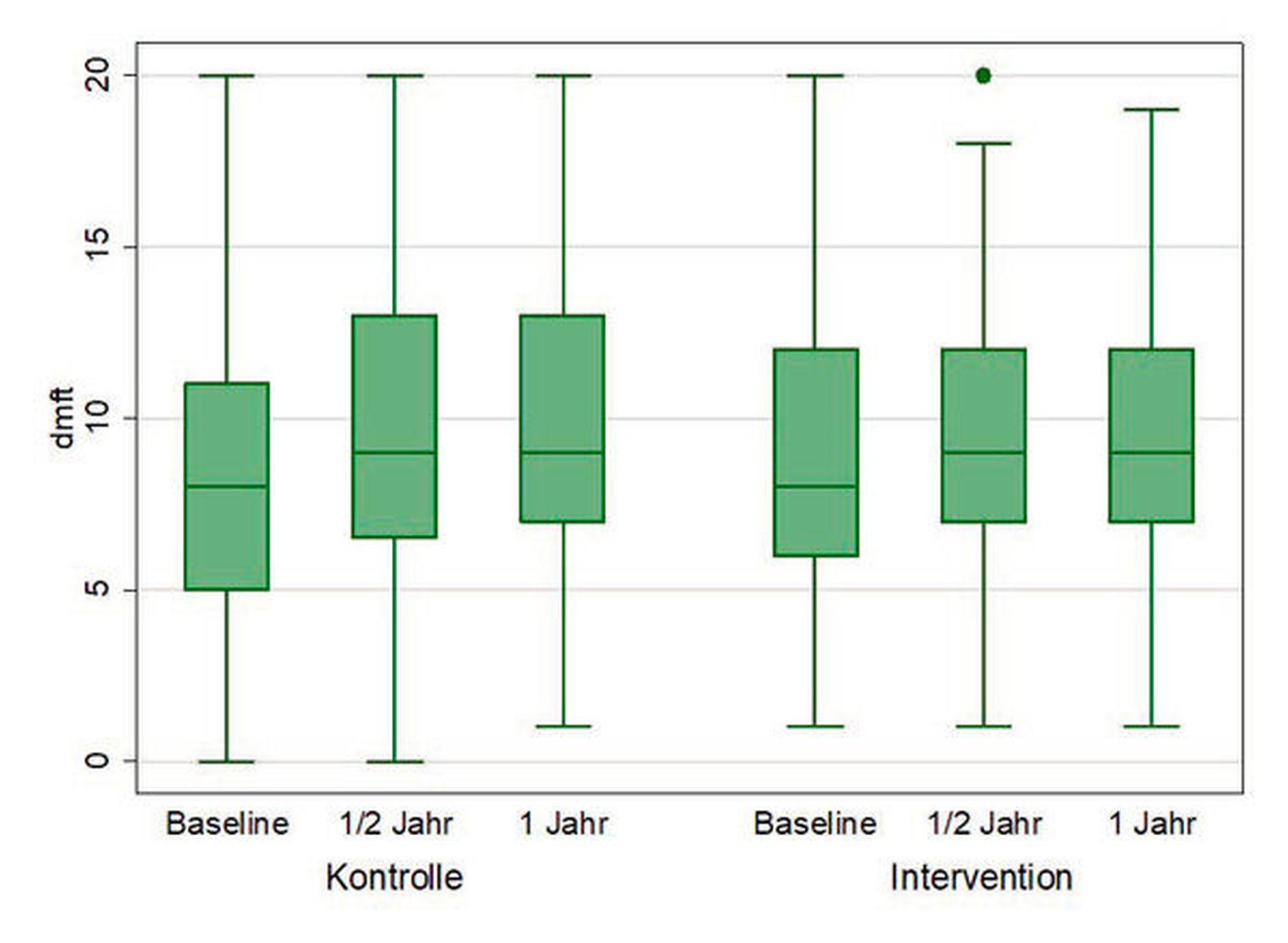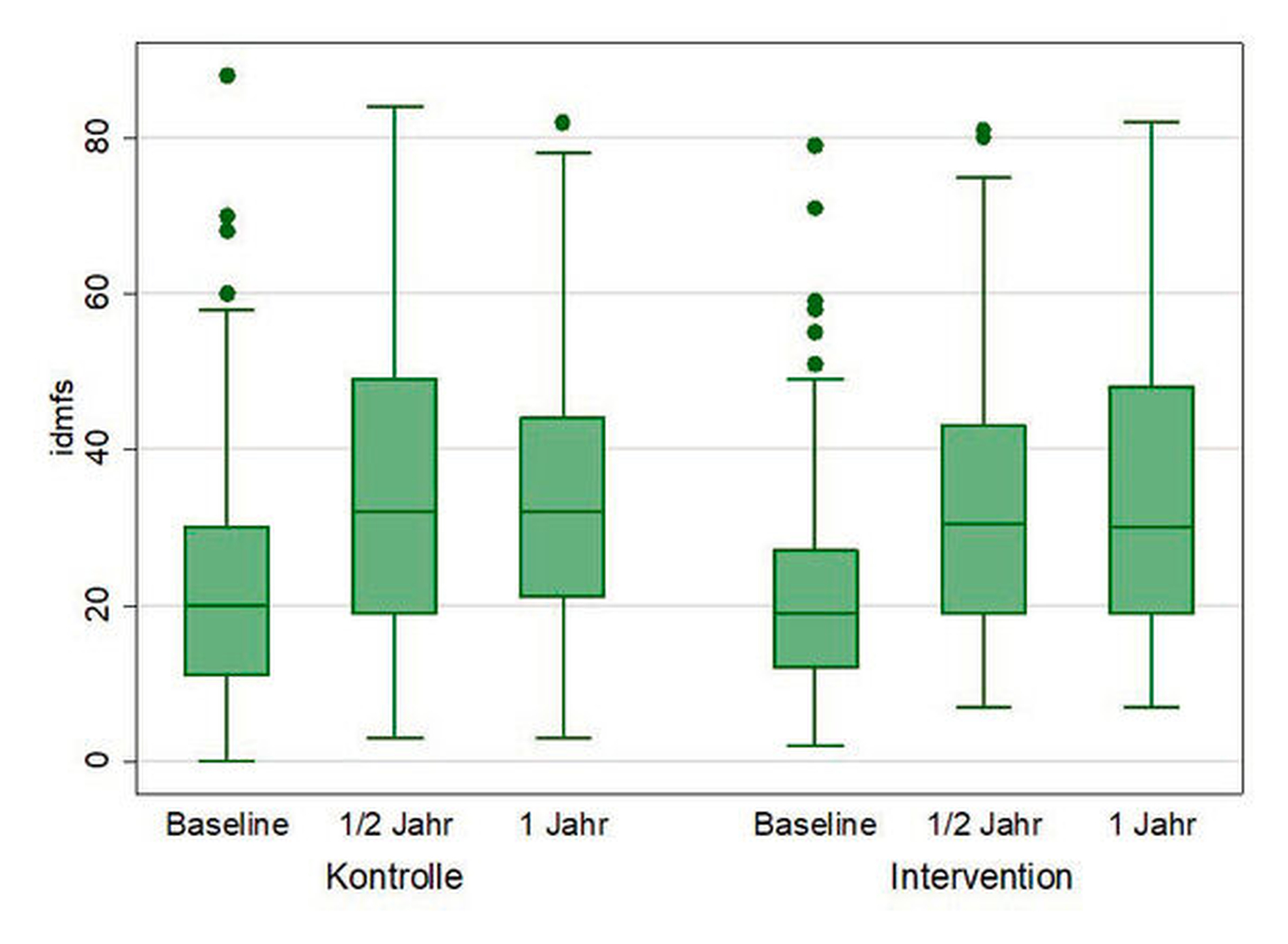 Die Daten wurden nach international etablierten Indizes bei der Ausgangsuntersuchung sowie bei den Untersuchungen sechs und zwölf Monate nach der Intervention erhoben (dmft/s inklusive kariöser Initialläsionen, API, SBI).