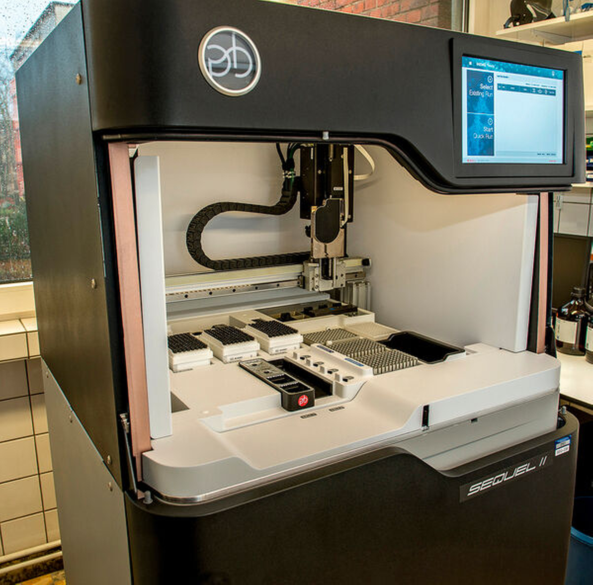 Voraussetzung für das Ablesen der gattungs- beziehungsweise speziesspezifischen Sequenz ist die Erstellung einer sogenannten Bibliothek, die dann mit einem Sequenziergerät ausgelesen werden kann. Der erste Schritt bei der Herstellung so einer 16S-rRNA-Bibliothek ist die Vervielfältigung (Amplifikation) des 16S-rRNA-Genabschnitts, der für die Identifizierung verwendet werden soll. Wie bei der Sanger-Sequenzierung wird dies über eine PCR erreicht, in der universelle Primer eingesetzt werden, die sich in einem der konservierten Bereiche des 16S-rRNA-Gens anlagern können und so die Vervielfältigung des gewünschten Abschnitts von nahezu allen Bakterienarten ermöglichen. Aufgrund des höheren Durchsatzes kann bei der NGS-Sequenzierung aber der kostenintensive Klonierungsschritt zur Vereinzelung der 16S-rRNA-Gene aus der Patientenprobe entfallen. Im nächsten Schritt der Bibliothekserstellung für die NSG-Sequenzierung werden spezifische, an die jeweilige Technologie angepasste Adapter eingefügt, die gleichzeitig mit einem Index versehen sind. Dies ist eine Art molekularer Barcode, eine kurze einzigartige Abfolge von Nukleotiden, die die Zuordnung der einzelnen Sequenzierungsreads zur jeweiligen Ursprungsprobe und damit nicht nur die parallele Analyse aller Bakterien aus einer Probe, sondern auch eine parallele Untersuchung mehrerer Patientenproben ermöglicht. Je nach Durchsatz des verwendeten Systems können so bis zu 384 Patientenproben in einem Sequenzierungslauf analysiert werden (Abbildung 2).
