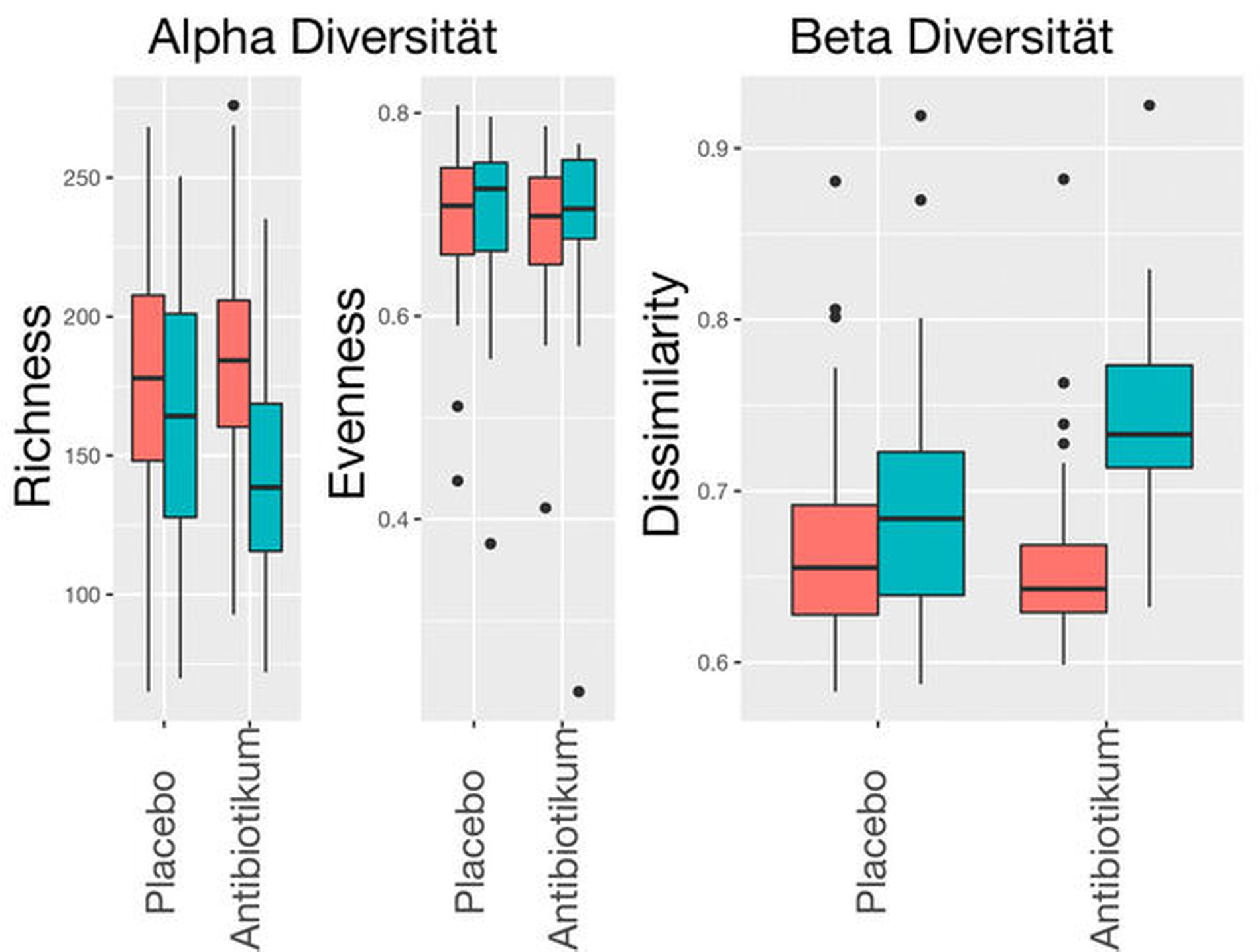 In Patienten mit Stadium-III/IV-Parodontitis nahm, verglichen mit der Ausgangsuntersuchung, die Artenvielfalt in subgingivalen Proben acht Wochen nach ausschließlich mechanischer Parodontitistherapie mit Schallscalern und Gracey-Küretten nur leicht ab (Placebogruppe, Abbildung 6). Im Gegensatz dazu konnten in dieser Studie bei Patienten, die zusätzlich zur mechanischen Therapie eine systemische Antibiotikabehandlung über sieben Tage mit 400 mg Metronidazol und 500 mg Amoxicillin erhielten, signifikante Mikrobiomveränderungen nach acht Wochen gefunden werden [Hagenfeld et al., 2018]. Die Richness im subgingivalen Mikrobiom war signifikant gegenüber dem Ausgangsbefund und der Kontrollgruppe reduziert (Antibiotikagruppe, Abbildung 6), was mit einer abnehmenden Artenvielfalt interpretiert werden kann. Weiter zeigte sich die deutliche Reduktion der Bakteriengenera, die potenziell parodontalpathogene Bakterien wie Porphyromonas ssp. und Tannerella ssp. enthalten. Gleichzeitig wurde ein Anstieg von unter anderem Actinomyceten ssp. gefunden, die eher bei parodontal gesunden Patienten zu den dominierenden Gattungen gehören. Die Evenness stieg an, was im Sinne einer gleichmäßigeren Häufigkeitsverteilung der Bakteriengenera im subgingivalen Mikrobiom interpretiert werden kann. Zusätzlich zeigte eine deutlich stärkere Veränderung der Beta-Diversität in der Antibiotikagruppe, dass sich in dieser Gruppe mehr Mikrobiome in ihrer Zusammensetzung signifikant von den Ausgangsmikrobiomen unterschieden. Sind die Mikrobiomveränderungen nach Parodontitistherapie mit adjuvanter systemischer Antibiose auch stärker ausgeprägt, lassen sich diese aber ebenfalls in der ausschließlich mit mechanischer Therapie behandelten Gruppe erkennen. Diese Mikrobiomveränderungen waren in beiden Behandlungsgruppen mit einer, in der Antibiotikagruppe zwar ausgeprägteren, aber auch in der Scalinggruppe gleichsam deutlichen und klinisch relevanten Verbesserung der klinischen Parameter verbunden.