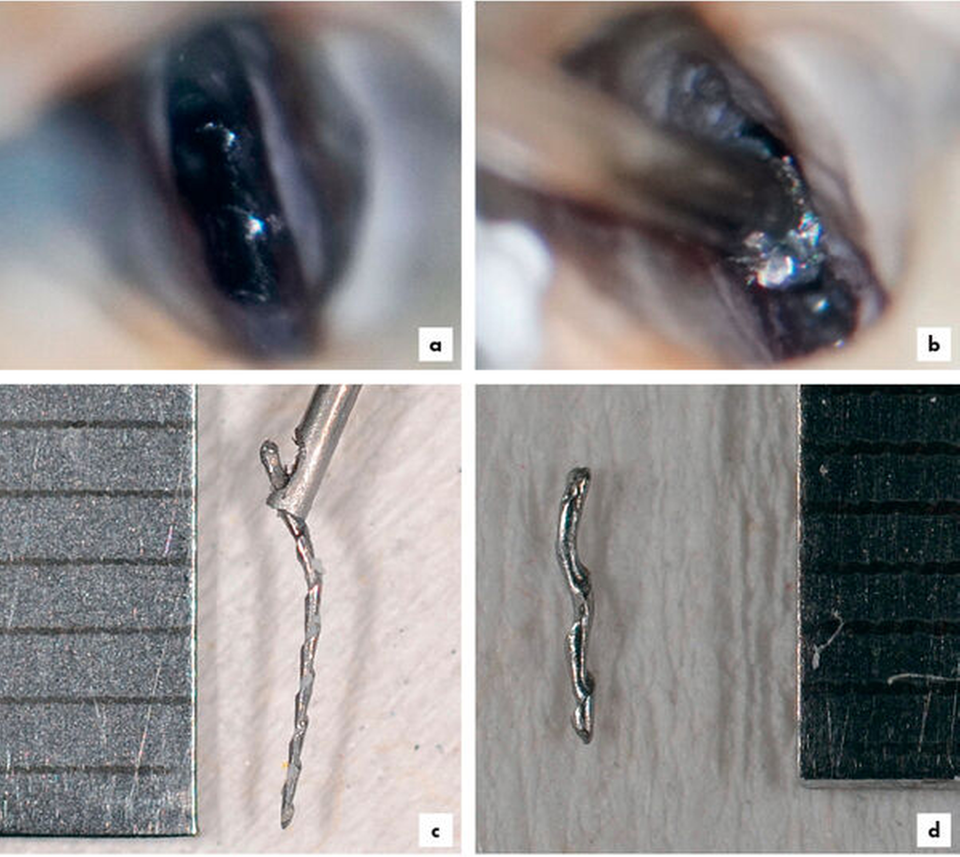 Es existieren verschiedene Techniken und Methoden, mit denen Instrumente entfernt werden können [Madarati, 2013]. Im Speziellen soll hier auf die Entfernung mittels einer selbst herstellbaren Tube-Dorn-Apparatur eingegangen werden. Diese Technik ist bei langen Fragmenten indiziert, wenn der koronale Anteil des zu entfernenden Instruments im koronalen oder im mittleren Wurzeldrittel lokalisiert ist (Abbildung 1). Der apikale Instrumentenanteil kann hierbei im mittleren oder im unteren Wurzeldrittel oder sogar über den Apex hinaus lokalisiert sein [Arnold, 2013].