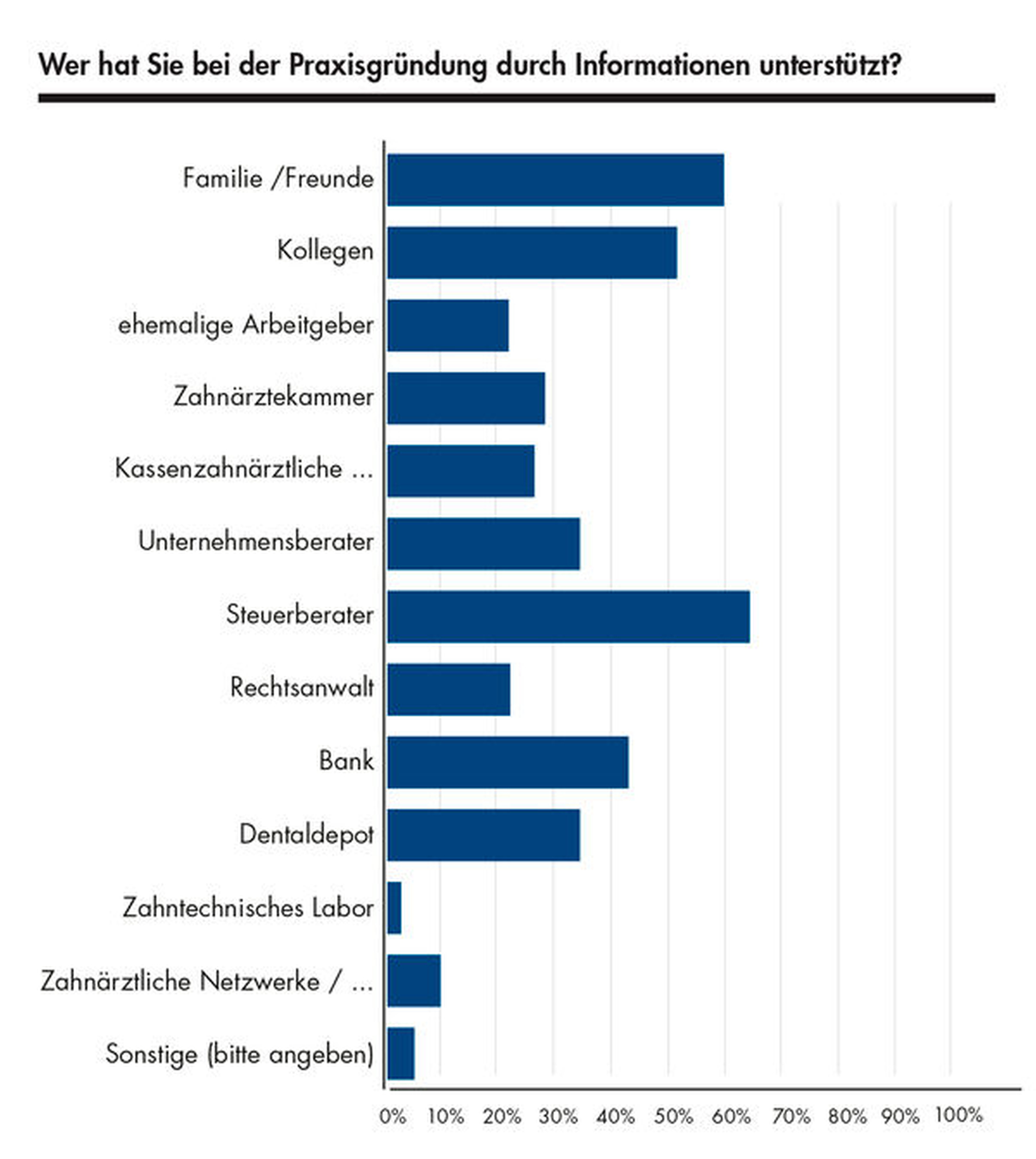 Sie selbst wurden bei ihrer Niederlassung zumeist von ihrem Steuerberater, ihrer Familie, Freunden und Kollegen unterstützt, gefolgt von Banken, Unternehmensberatern und Dentaldepots. Nur knapp ein Drittel hatte sich an die Kammer oder an die KZV gewandt. Insgesamt 23 Prozent erhielten durch ehemalige Arbeitgeber und Rechtsanwälte Support, nur 10 Prozent von zahnärztlichen Netzwerken.Zwei Drittel von ihnen hatten an einer Fortbildung zum Thema Praxisgründung teilgenommen, ein Drittel hatte entsprechende Veranstaltungen der Kammern oder KZVen besucht. Etliche besuchten auch Fortbildungen von Depots und/oder nahmen Angebote von Banken und Wirtschaftsberatungen in Anspruch.