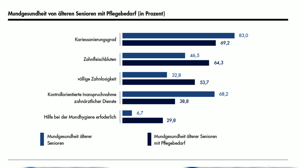 Pflegekräfte stehen vor der Herausforderung, dass Menschen mit Pflegebedarf immer mehr eigene Zähne beziehungsweise technisch aufwendigen und teilweise implantatgestützten Zahnersatz haben. Deshalb ist es heute mehr denn je notwendig, dass bei diesen Menschen am besten mehrmals täglich eine bedarfsgerechte Mund- und Prothesenhygiene durchgeführt wird. Neben Mundgeruch und ästhetischen Beeinträchtigungen kann eine schlechte Mundgesundheit nicht nur durch schmerzbedingt aggressives Verhalten den Pflegealltag erheblich belasten. Auch die Auswirkungen einer schlechten Mundgesundheit auf den allgemeinen Gesundheitszustand, die Ernährung und das Wohlbefinden sind evident. Die fünfte deutsche Mundgesundheitsstudie [DMS V, 2016] belegt, dass viele pflegebedürftige Menschen Unterstützung bei der Zahn-, Mund- und Zahnersatzpflege benötigen.