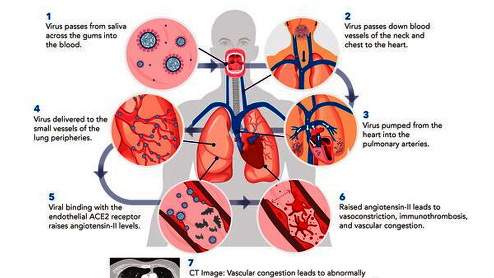 Einmal in den Blutkreislauf gelangt, könnte das Virus über die Jugularvene und die Vena cava in den rechten Vorhof des Herzens gelangen und von der rechten Herzkammer über die Lungenarterien in die Lunge gepumpt werden. Hier bindet SARS-CoV-2 an ACE-2-Rezeptoren auf dem auskleidenden Endothel der Lungengefäße an der Basis der Lunge. Aus dieser Bindung resultiert ein unregulierter Anstieg von Angiotensin-II, was eine Verengung und Entzündung der Blutgefäße (endotheliale Dysfunktion) und auch die Bildung von Blutgerinnseln verursacht. Die Blutgerinnsel sind ein Versuch des Körpers, den Austritt des Virus aus der Lunge in den Rest des Körpers zu verhindern. Die blockierten Gefäße verursachen jedoch eine Stauung in der Lunge sowie alle bekannten Anzeichen und Symptome einer schweren COVID-19-Lungenerkrankung.