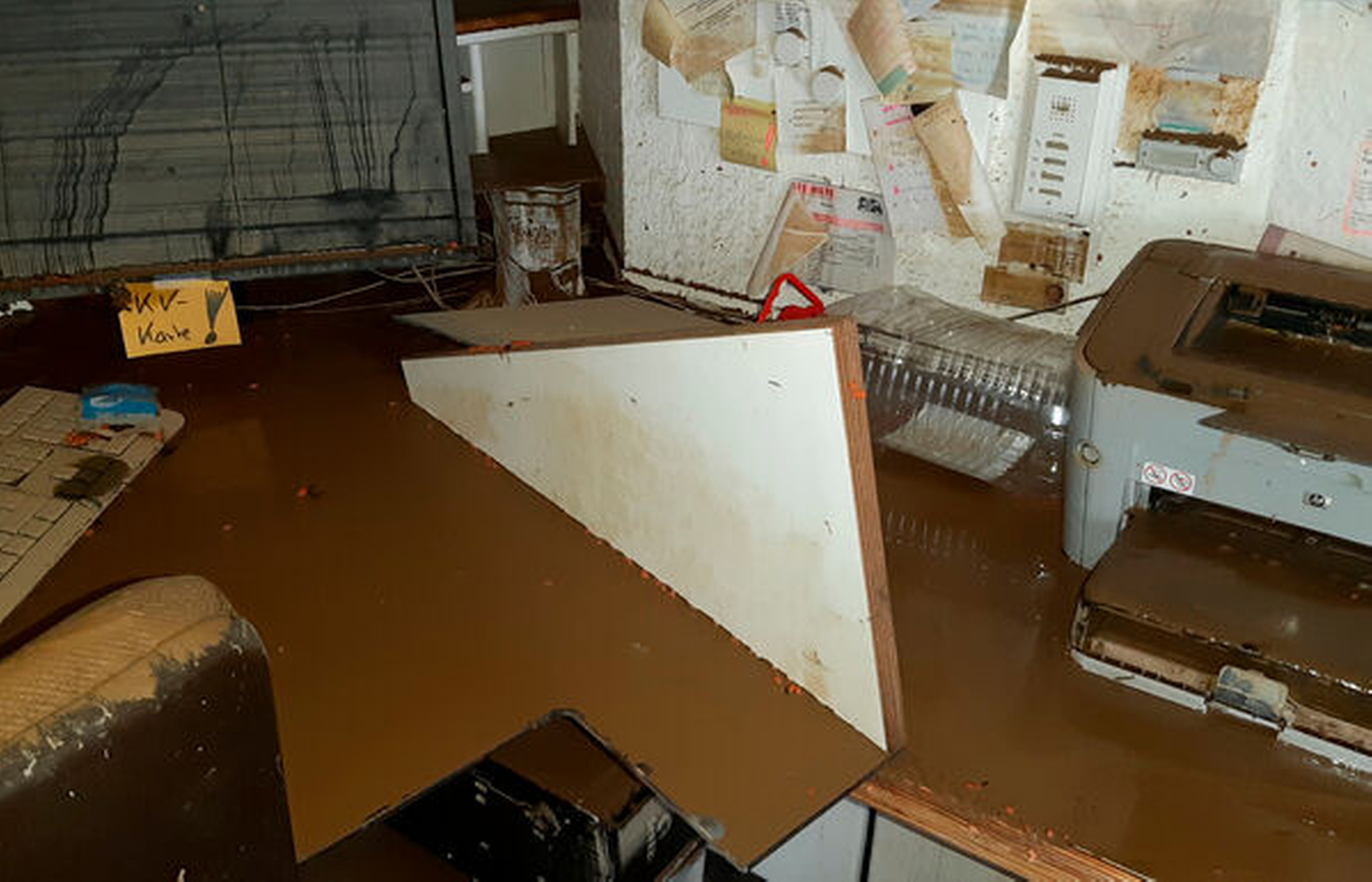 „Plötzlich kam das Wasser aus dem Wänden geschossen und innerhalb von fünf Minuten stand es 20 Zentimeter hoch in der Praxis”, berichtet Jung, der sich mit einem Allgemeinmediziner, der im selben Gebäude praktiziert, ins zweite Obergeschoss in eine Mietwohnung rettet.