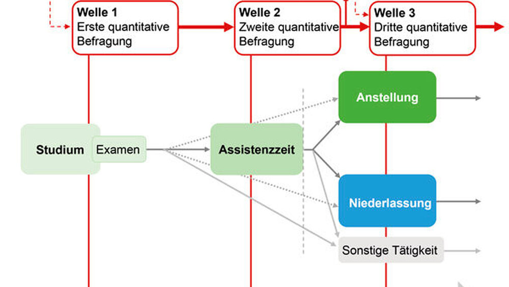 Dem Buch vorausgegangen ist die Studie „Y-Dent – Berufsbild angehender und junger Zahnärzte“. Dabei wurden Zahnmedizinerinnen und -mediziner zwischen in ihren letzten Universitäts- und ersten Berufsjahren 2014 und 2019 begleitet und regelmäßig nach ihren Erfahrungen in dieser Zeit und ihren Vorstellungen und Wünschen für die Zukunft befragt (Abbildung 1). An der ersten quantitativen Erhebung nahmen 1.395 Studierende der 9. und 10. Semester teil. 2017 wurden genau diese Frauen und Männer erneut befragt, die sich zu diesem Zeitpunkt größtenteils in der Assistenzzeit befanden (635 Teilnehmende). Eine dritte Befragungswelle wurde 2019 durchgeführt; zu diesem Zeitpunkt waren die Studienteilnehmenden den Angaben zufolge mehrheitlich im Angestelltenverhältnis beschäftigt und einige wenige bereits niedergelassen (573 Teilnehmende). In der Studie wurden sowohl qualitative als auch quantitative Erhebungsmethoden eingesetzt.