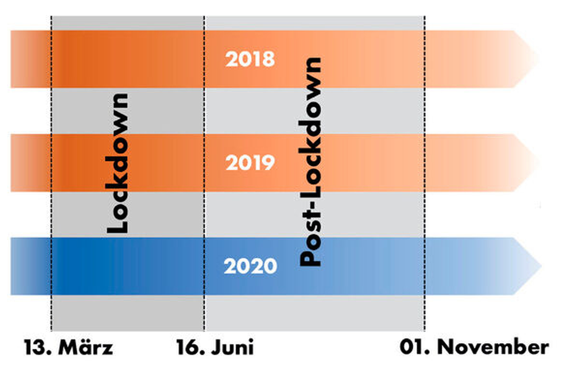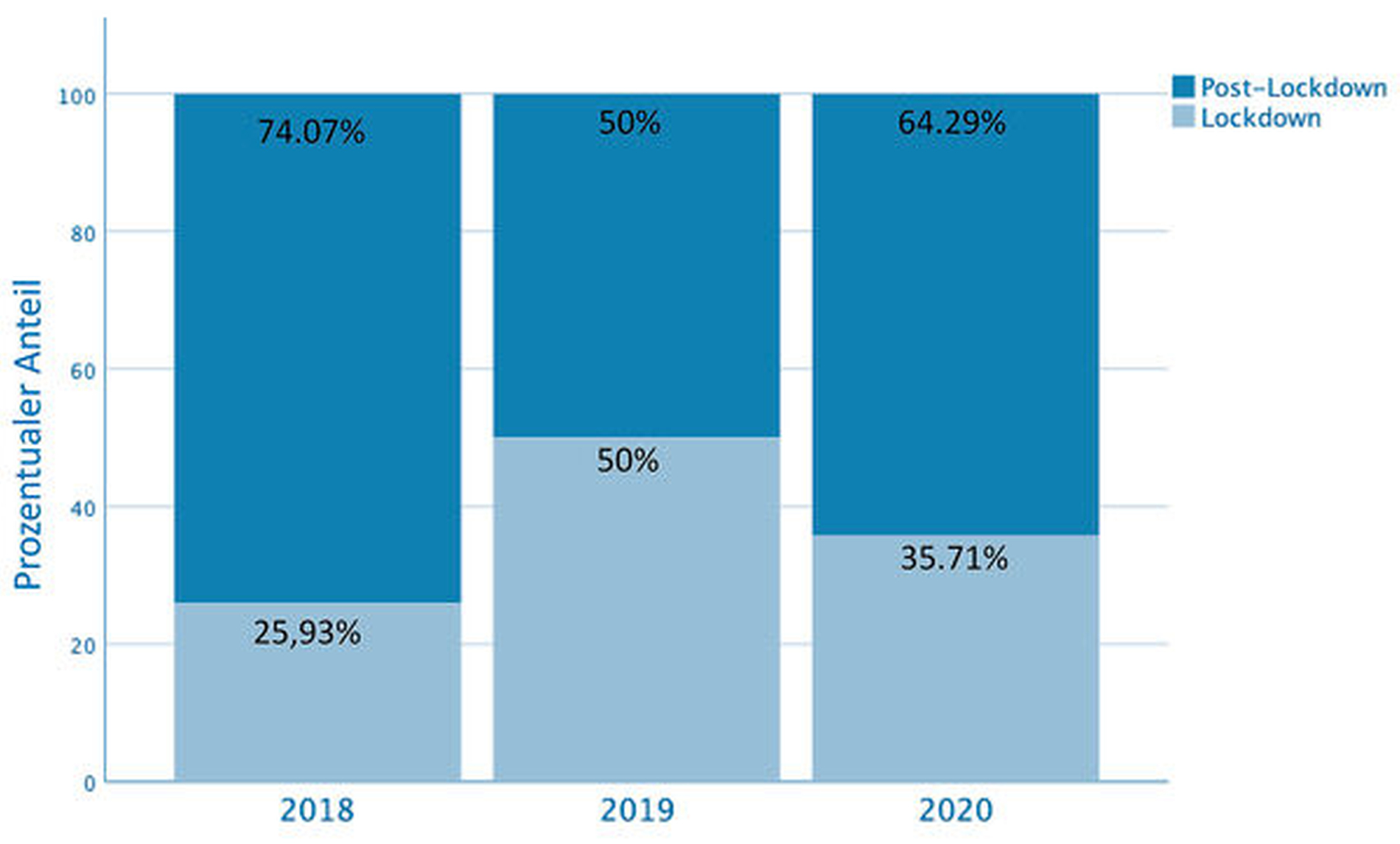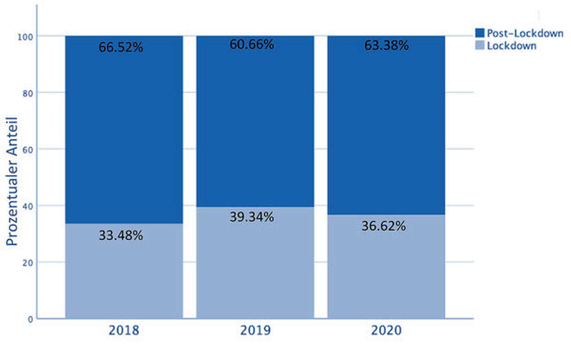Hierzu wurden Daten von Patienten gesammelt, deren Krebserkrankung während eines bestimmten Zeitraums erstdiagnostiziert wurde. Eingeteilt wurden die Zeiträume in „Lockdown“ (13.03.2020 bis 16.06.2020), „Post-Lockdown“ (17.06.2020 bis 01.11.2020) und entsprechend äquivalente Zeiträume in den Jahren 2018 und 2019 als Referenz (Abbildung 1). Erhoben wurden die in der Tabelle dargestellten Parameter.