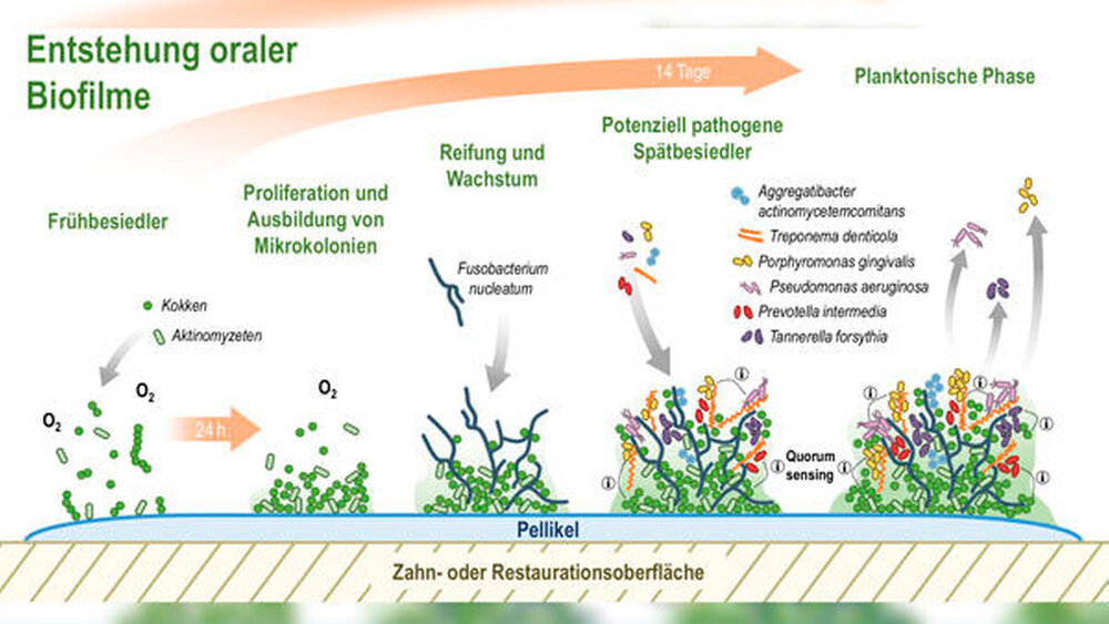 Die Biofilmformation beginnt binnen weniger Sekunden bis Minuten nach dem Zähneputzen mit der Bildung der sogenannten erworbenen Pellikel [Hannig, 1999; Jong et al., 1984] (Abbildung 1). Diese ist ein azellulärer, semipermeabler Film insbesondere aus Speichelproteinen, der auf allen Oberflächen der Mundhöhle und dentaler Restaurationen entsteht. Die Pellikel dient unter anderem der Befeuchtung und dem Schutz des Zahnes. Gleichzeitig bildet sie die Voraussetzung für das Attachment sogenannter Frühbesiedler-Mikroorganismen wie grampositiver Kokken und Aktinomyzeten. Diese vermehren sich und bilden Mikrokolonien innerhalb des ersten Tages. Erfolgt keine Reinigung der Zahn- oder Restaurationsoberfläche, so binden diese Mikrokolonien im Laufe der Zeit weitere Bakterien sowie Pilze im reifenden Biofilm. Dabei spielt das sogenannte Brückenbakterium Fusobacterium nucleatum eine zentrale Rolle. Dieses ermöglicht eine Anknüpfung von potenziell pathogenen Spätbesiedlern wie Aggregatibacter actinomycetemcomitans, Treponema denticola, Porphyromonas gingivalis und Prevotella intermedia an die Frühbesiedler. Vereinfacht lässt sich sagen, dass zu den Frühbesiedlern häufig grampositive, aerotolerante Kokken gehören, während zu den Spätbesiedlern eher gramnegative und anaerobe Stäbchen oder Filamente zählen. Während supragingival häufig aerobe Mikroorganismen vorzufinden sind, leben in der Tiefe des Sulkus vornehmlich anaerobe Bakterien [Mark Welch et al., 2016]. Dabei können aerobe Mikroorganismen wie Streptokokken Sauerstoff verstoffwechseln und dadurch anaerobe Verhältnisse schaffen [Mark Welch et al., 2016].
