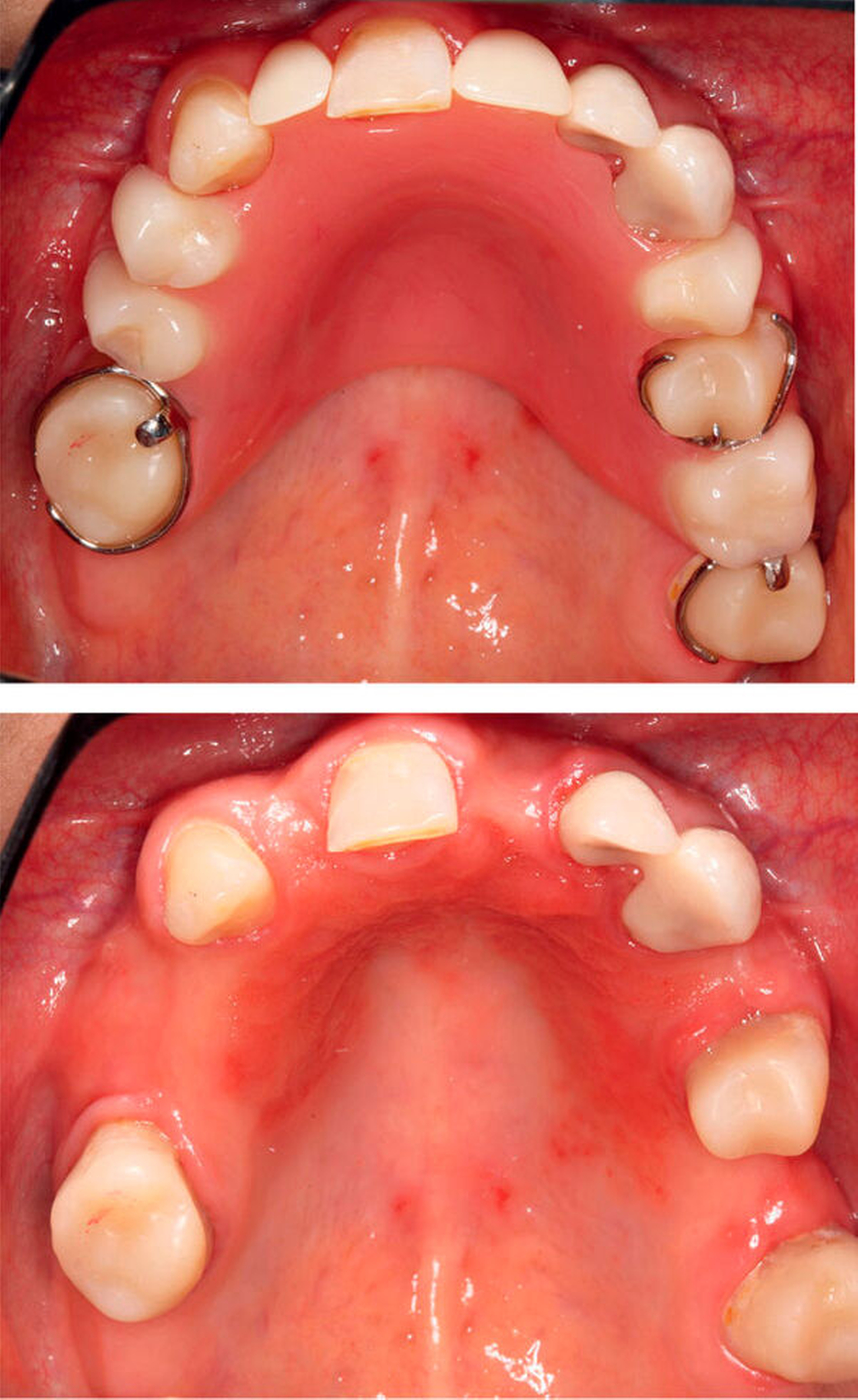 Während die Studienlage nicht zuletzt aufgrund der Heterogenität der Methodik unübersichtlich ist, ist allgemein akzeptiert, dass raue Prothesenmaterialien eine größere Anheftungsoberfläche für Mikroorganismen bieten. Gleichermaßen bilden schwer zugängliche Abschnitte des Zahnersatzes Nischen für die Anheftung von Biofilm (beispielsweise am Übergang zwischen Prothesenzahn und Prothesenkörper; Abbildung 5). Ist die Mundhygiene des betagten Patienten stark eingeschränkt, ist bei der Ausgestaltung des Zahnersatzes insbesondere auf die leichte Reinigungsfähigkeit zu achten. Möglicherweise kann die Prothese oral und vestibulär mit einem glasklaren Kunststoff überzogen werden (beispielsweise mit Polymethylmethacrylat), um für die Prothesenhygiene kritische Übergänge zu nivellieren. Dadurch kann die Speiseretention reduziert und die Reinigung des Zahnersatzes erleichtert werden. Darüber hinaus sollte bei dieser Patientengruppe auf Versorgungen verzichtet werden, die eine ausgeprägte Geschicklichkeit bei der Mundhygiene erfordern.