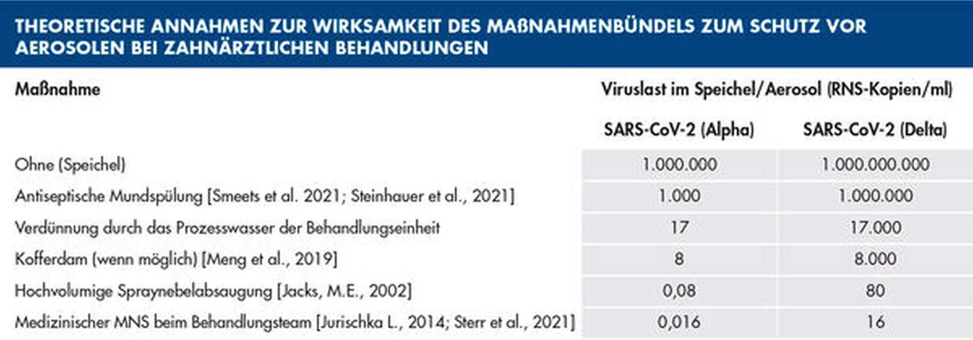 Genaue Angaben zur minimalen Infektionsdosis von SARS-CoV-2 liegen noch nicht vor. Sie wird aber auf einige hundert bis tausend Viren geschätzt. Das in der AWMF-Leitlinie zum Umgang mit zahnmedizinischen Patienten bei Belastung mit Aerosol-übertragbaren Erregern angegebene Maßnahmenbündel gewährleistet nach den gegenwärtigen Erkenntnissen auch eine hohe Sicherheit gegenüber der neuen, infektiöseren SARS-CoV-2-B.1.617.2-Variante (Delta). Internationale Studien belegen diese Annahmen [Meethil et al., 2021].