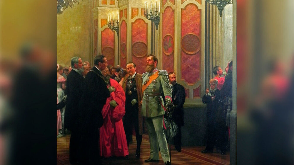 Ein historisches Gemälde des Hofmalers Anton von Werner (1843–1915), das heute in der Alten Nationalgalerie in Berlin hängt, verdeutlicht die Stellung Virchows in der kaiserlichen Gesellschaft sehr eindrücklich: Es zeigt den damaligen Kronprinzen Friedrich Wilhelm (1831–1888) – den späteren Kaiser Friedrich III. – beim Hofball 1878 im Weißen Saal des Berliner Schlosses im Gespräch mit dem Reichstagspräsidenten und Berliner Oberbürgermeister Max von Forckenbeck (1821–1892). Im roten Talar auch abgebildet: der Dekan der medizinischen Fakultät der Friedrich Wilhelms Universität, Rudolf Virchow. Die Gruppe um den liberalen Kronprinzen gehörte zu einer kleinen Minderheit aufgeschlossener und fortschrittlicher Größen des Kaiserreichs, die sich gegen eine große Mehrheit nationalistischer Konservativer stellte. In diesem Spannungsfeld stand Virchows politisches Engagement, das er als Berliner Stadtverordneter begann und später als Abgeordneter im Preußischen Abgeordnetenhaus und Reichstag fortsetzte.