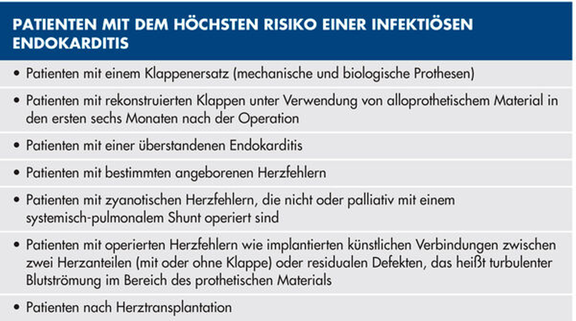 Bei verschiedenen invasiven zahnärztlichen Eingriffen können in unterschiedlichem Ausmaß transistorische Bakteriämien mit Endokarditis-typischen Erregern (unter anderem orale Streptokokken der sogenannten Viridansgruppe und Staphylococcus aureus) entstehen [Lockhart, 2000; Fowler et al., 2005]. Tabelle 1 listet entsprechend den Empfehlungen der American Heart Association [Wilson et al., 2007] und dem Positionspapier der Deutschen Gesellschaft für Kardiologie – Herz- und Kreislaufforschung e. V. [Naber et al., 2015] die Patientengruppen mit dem höchsten Endokarditisrisiko auf.