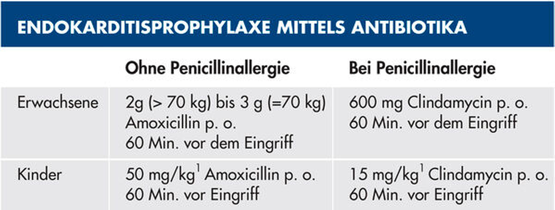 Ziel der präoperativen antimikrobiellen Therapie ist es, bei Endokarditis-gefährdeten Patienten eine mögliche Bakteriämie zu verhindern. Generell sind Zahnextraktionen und blutende Maßnahmen im gingivalen/parodontalen Bereich oder in der periapikalen Region sowie Verletzungen der oralen Mukosa als Risikofaktor für Bakteriämien anzusehen [Zierholz, 2011]. Die Entscheidung darüber, ob ein Patient mit hohem Risiko einer infektiösen Endokarditis ambulant und unter welchem antibiotischen Schutz behandelt werden kann, sollte in Absprache mit dem Hausarzt oder dem behandelnden Kardiologen erfolgen. Falls eine Endokarditisprophylaxe indiziert ist, genügt entsprechend der Stellungnahme der DGZMK [Horstkotte, 1999; Wahl, 2009] und der Leitlinie der American Heart Association [Naber et al., 2007] in der Regel bei einer Behandlungssitzung eine präoperative Kurzzeittherapie mit Amoxicillin p. o. oder bei einer Penicillin-Unverträglichkeit mit Clindamycin p. o. (Single-Shot-Kurzzeittherapie) (Tabelle 2).