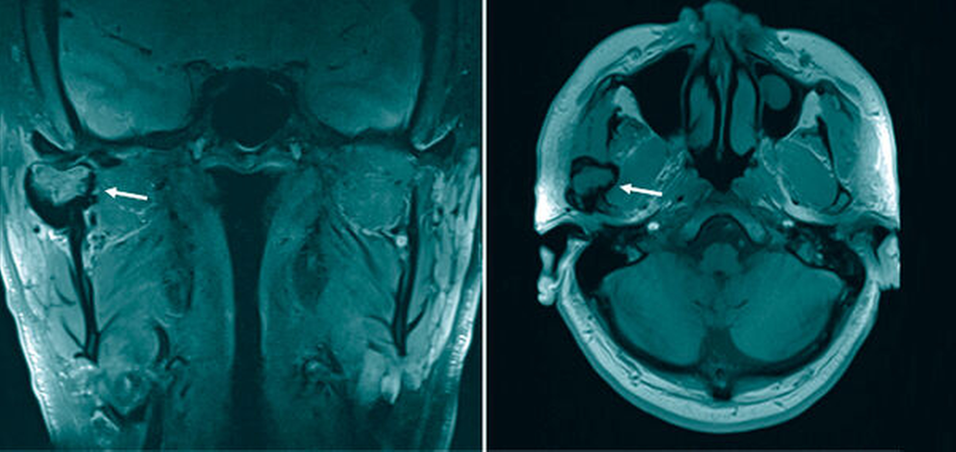 In der Panoramaschichtaufnahme (Abbildung 1) zeigte sich jedoch eine glatt begrenzte Aufhellung des rechten Capitulums. Zur weiteren Abklärung wurde eine Magnetresonanztomografie (MRT) des Gesichtsschädels veranlasst (Abbildung 2). Hier konnte eine Raumforderung im rechten Kiefergelenk nachgewiesen werden. Ergänzend wurde daraufhin eine CT-Untersuchung (Abbildung 3) durchgeführt, die einen im Durchmesser 31 mm großen Tumor mit Destruktion des rechten Capitulums zeigte.
