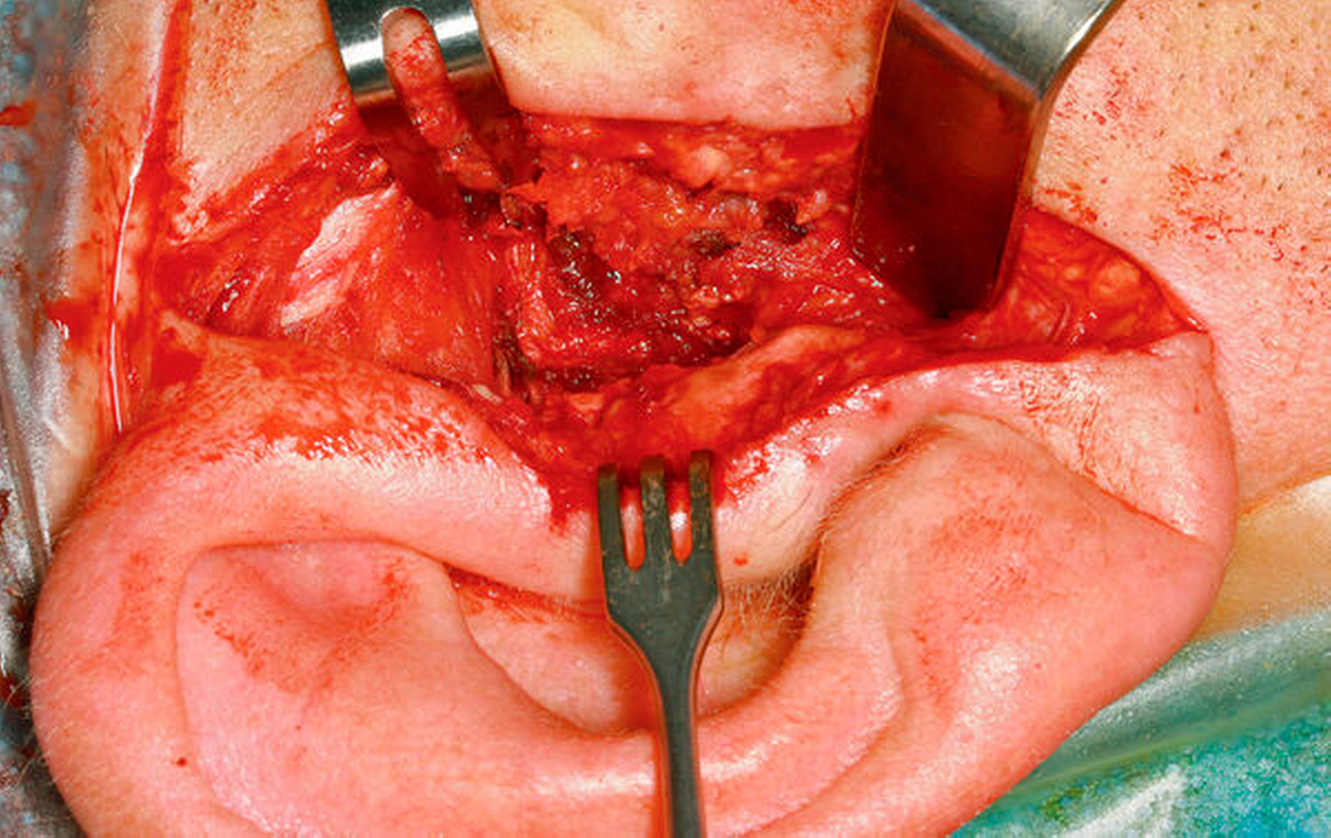 Nach interdisziplinärer Diskussion erfolgte im Rahmen einer zweiten Operation die Tumorresektion mit Synovektomie, Resektion des Diskus articularis und Capitulum mandibulae rechts in ITN (Abbildung 6). In der postoperativen Bildgebung mittels digitaler Volumentomografie (DVT) zeigte sich eine vollständige Resektion des befallenen Bereichs.