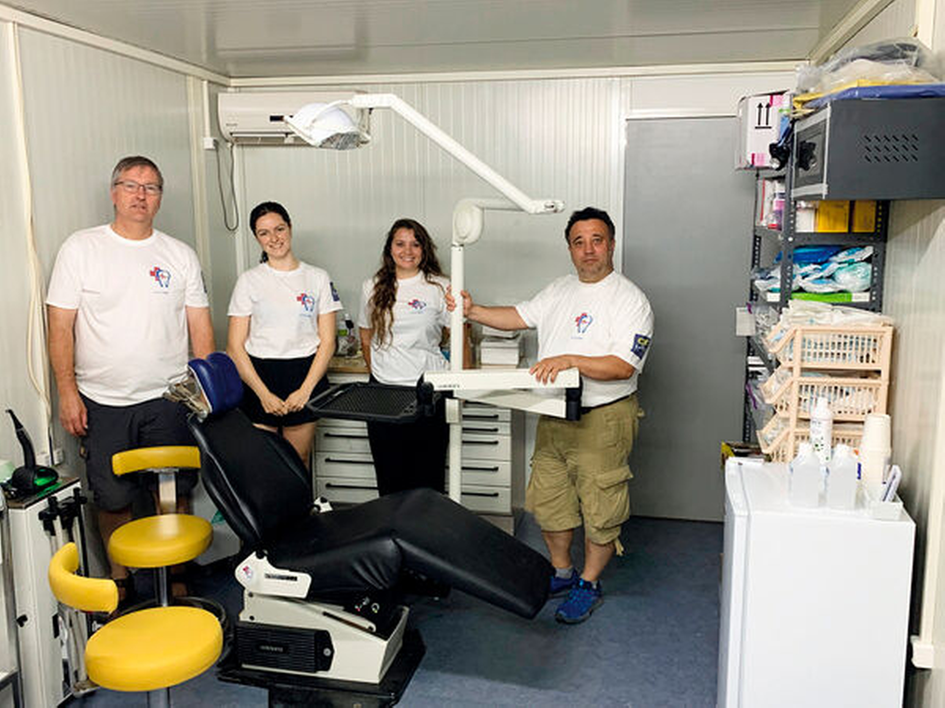 Anfang Juli machten wir – Dr. Armin Reinartz, Zahnärztin Ann Christin Schafigh, Dr. Alexander Schafigh und die frisch approbierte Zahnärztin Sabrina Wildhagen – uns schließlich auf den Weg nach Chios. Dort angekommen, legten wir mit unseren Partnern vor Ort sofort los: Innerhalb von zwei Tagen entstand die neue Zahnstation in einem Container.