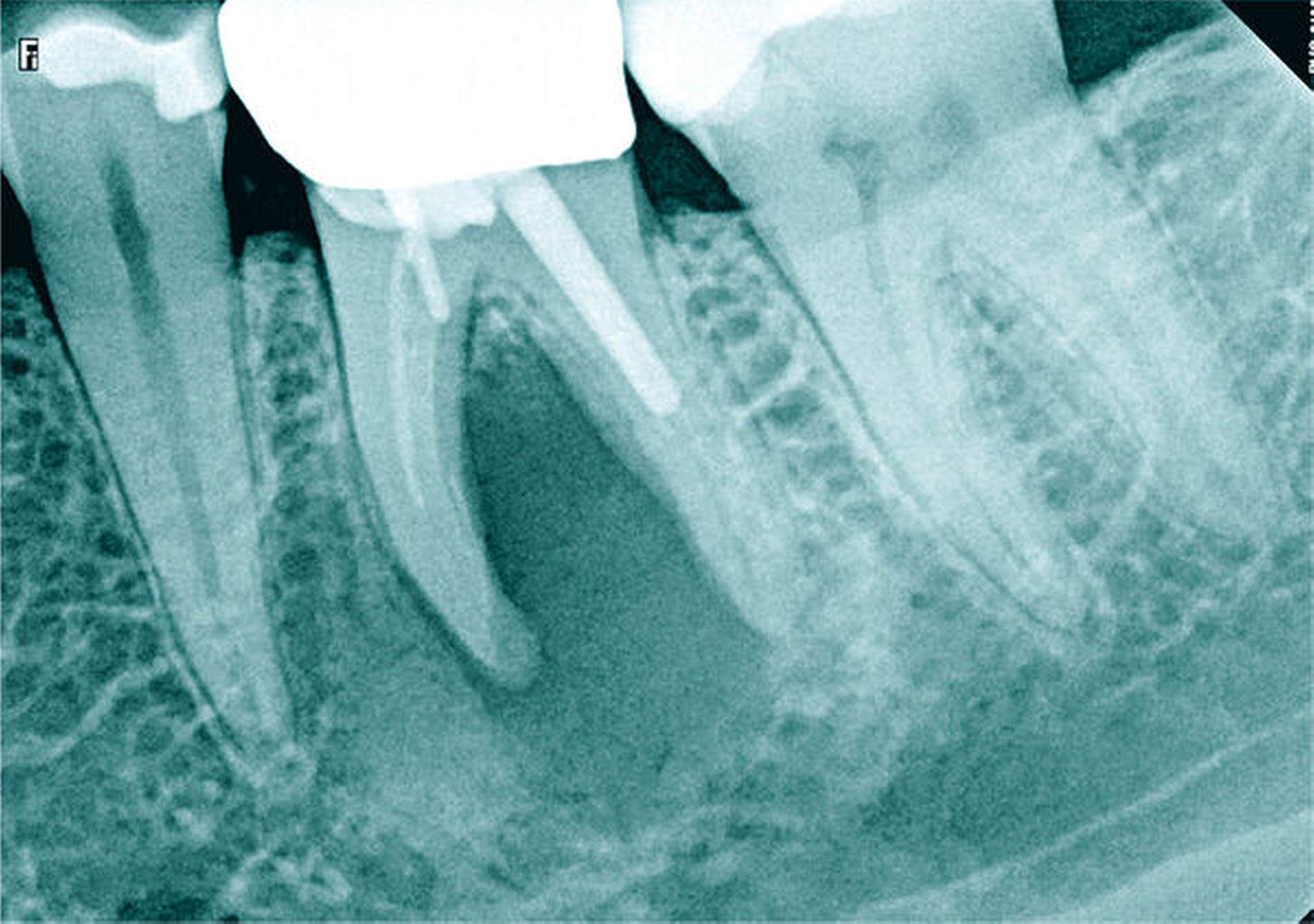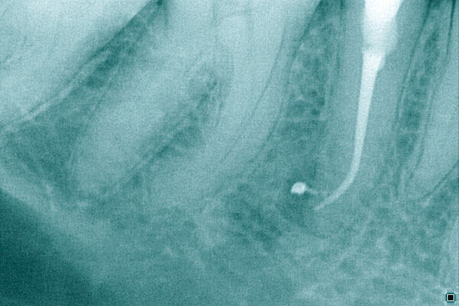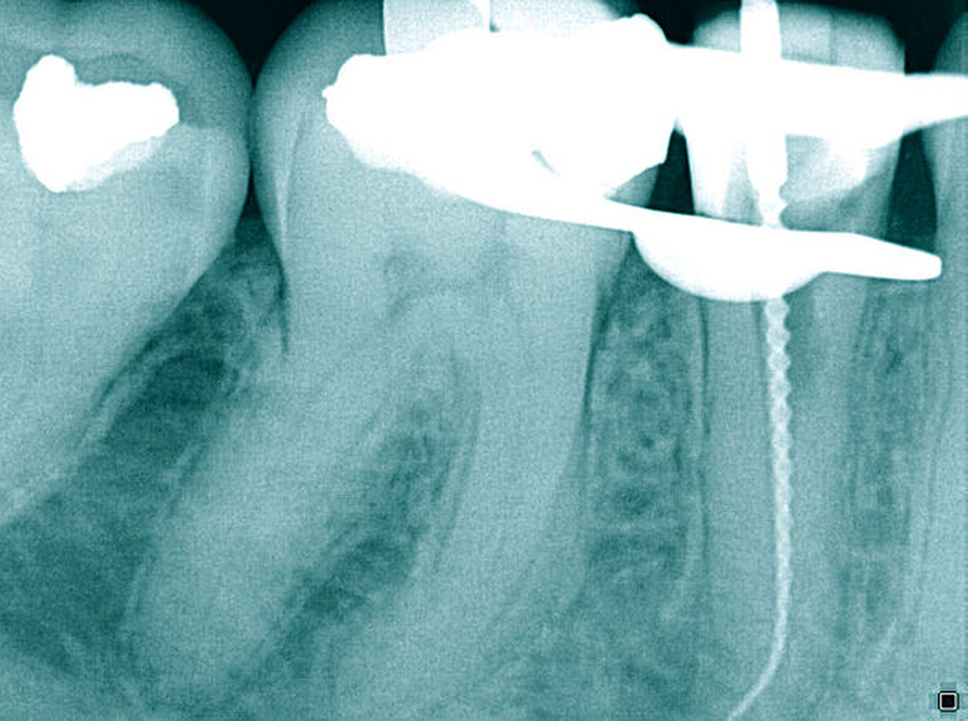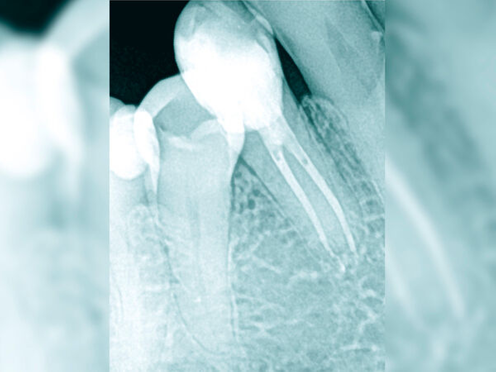 Die allgemeinmedizinisch unauffällige Patientin stellte sich mit pulpitischen Beschwerden im rechten Unterkiefer vor. Der Sensibilitätstest am Zahn 45 auf Kälte war stark positiv und reizüberdauernd. Auf den Perkussionstest reagierte der Zahn reproduzierbar verstärkt positiv. Radiologisch war ein pulpanahes, röntgendichtes Füllungsmaterial erkennbar und apikal ein verbreiterter Desmodontalspalt.