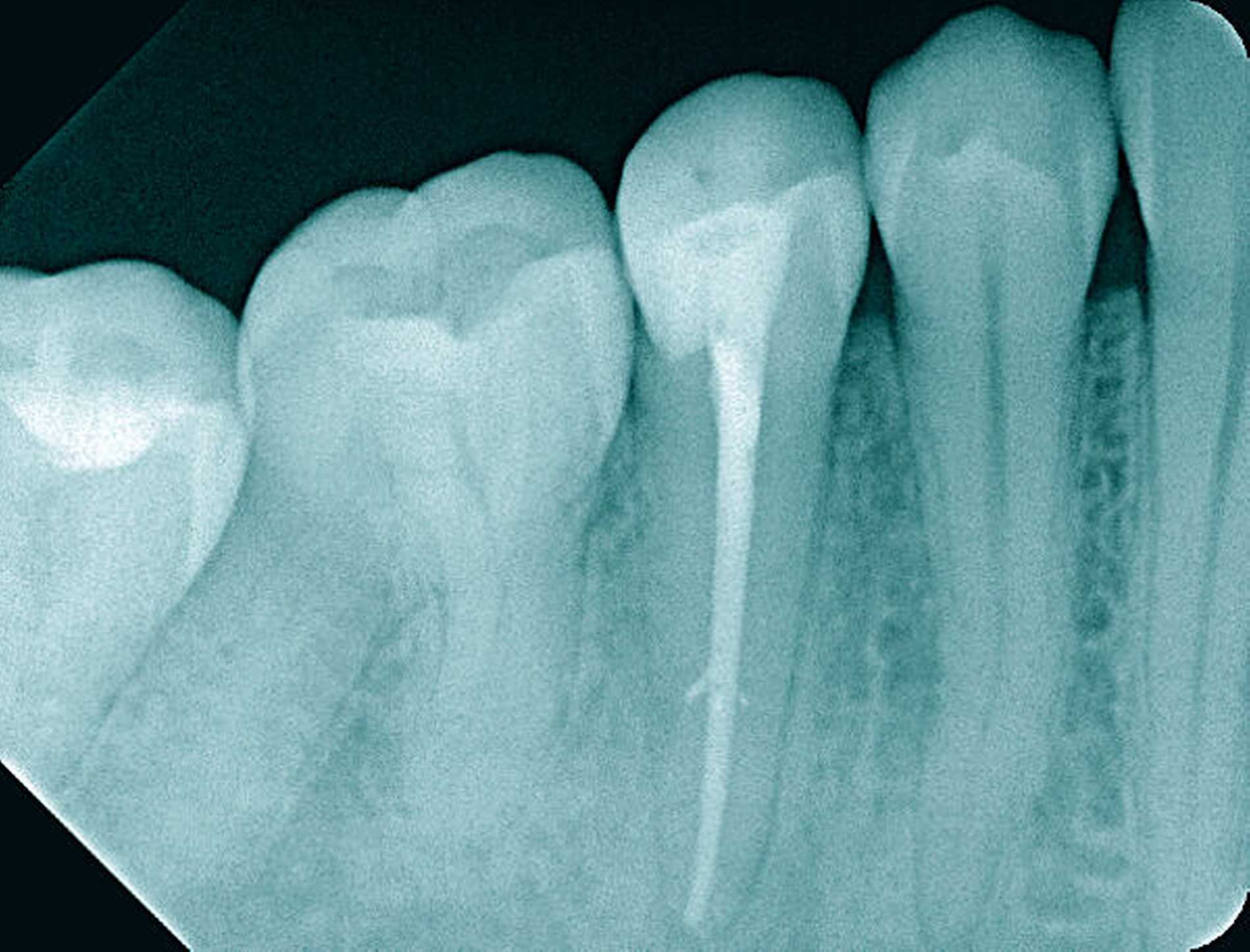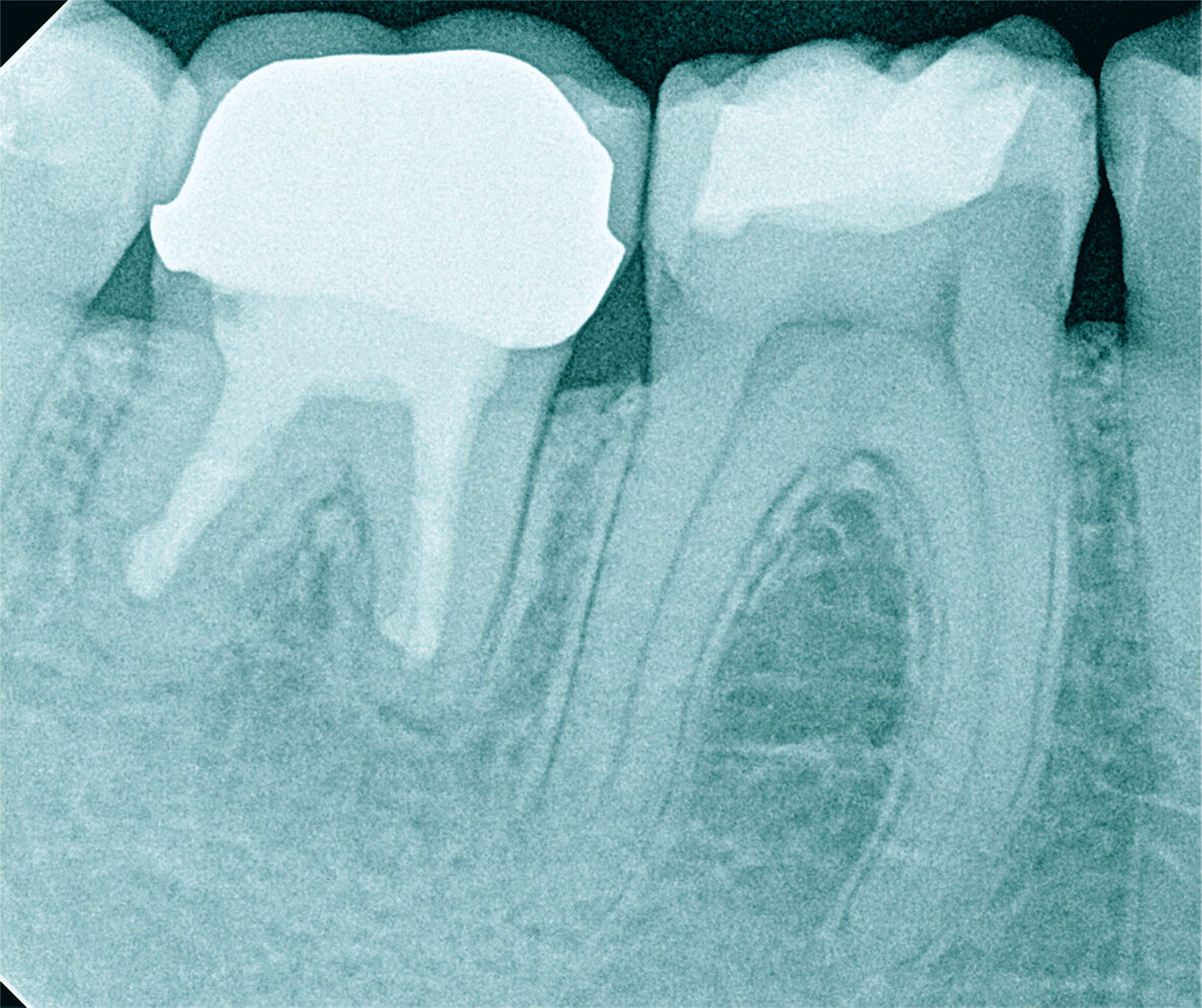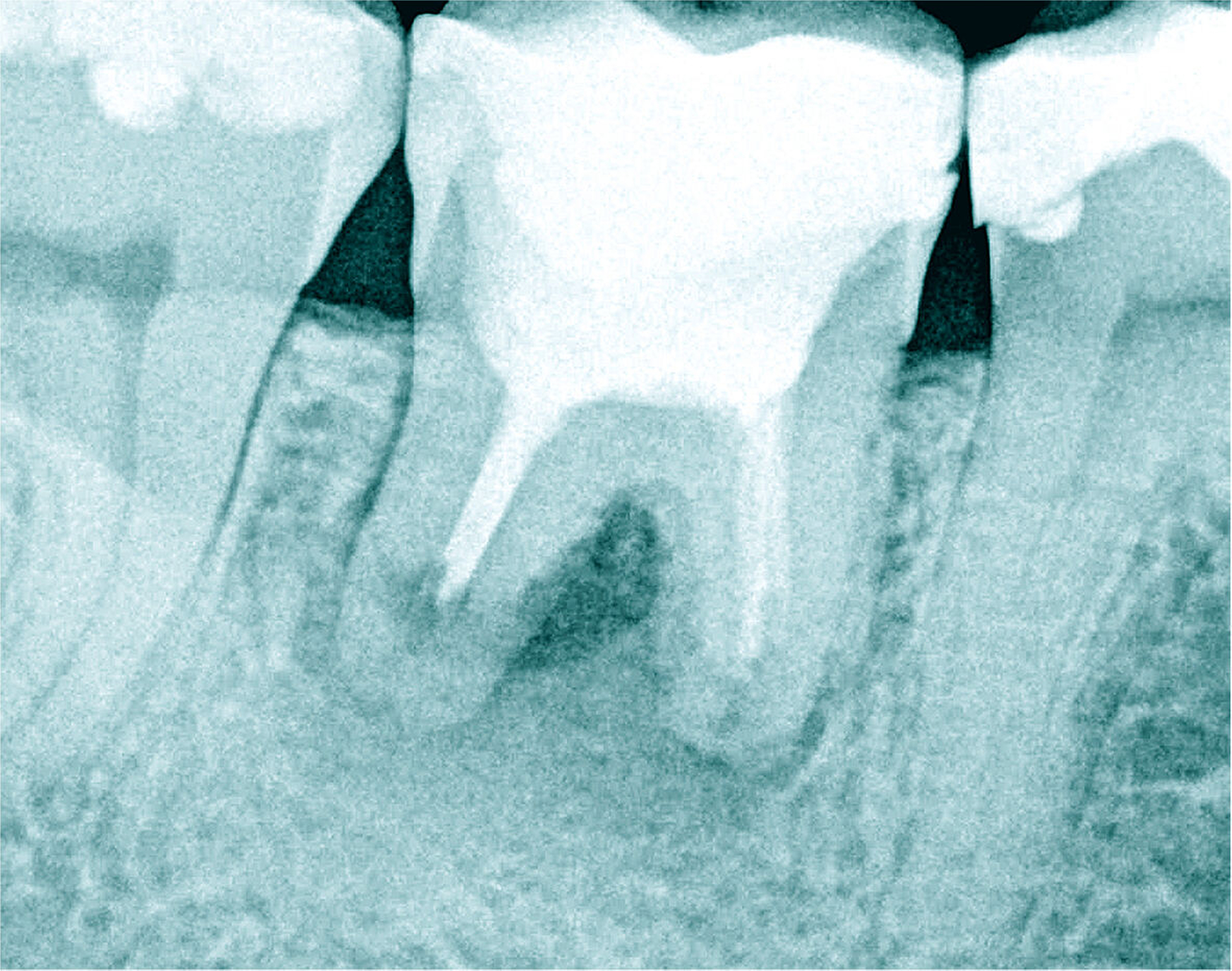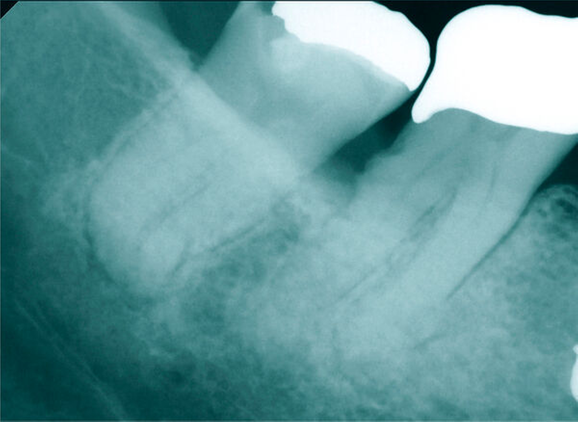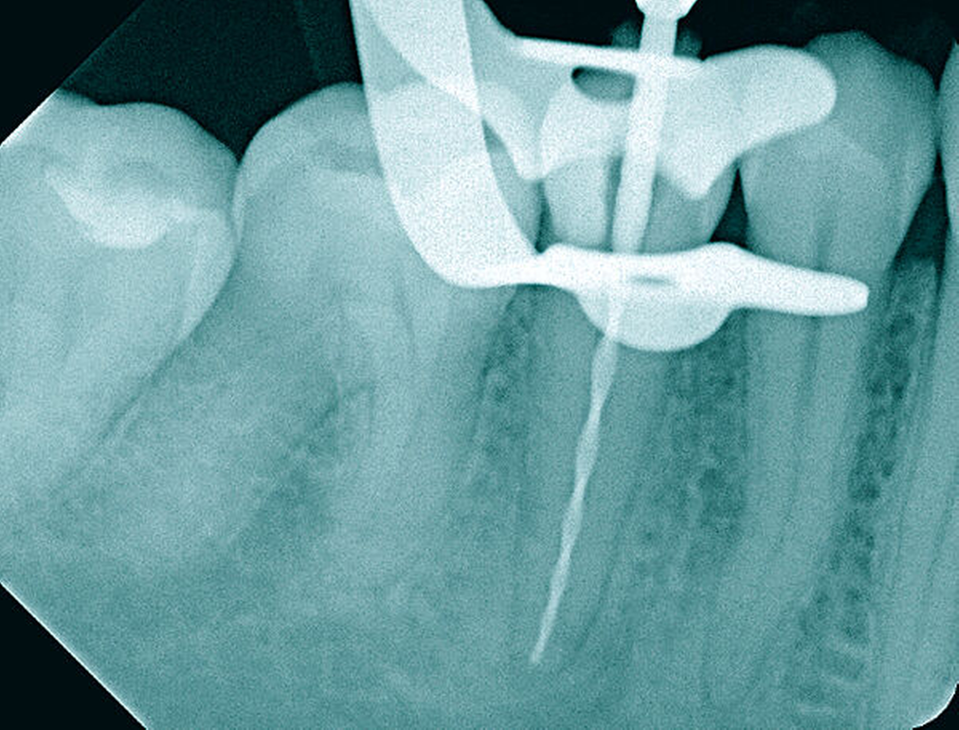 Die allgemeinmedizinisch unauffällige Patientin stellte sich mit pulpitischen Beschwerden im rechten Unterkiefer vor. Der Sensibilitätstest am Zahn 45 auf Kälte war stark positiv und reizüberdauernd. Auf den Perkussionstest reagierte der Zahn reproduzierbar verstärkt positiv. Radiologisch war ein pulpanahes, röntgendichtes Füllungsmaterial erkennbar und apikal ein verbreiterter Desmodontalspalt.
