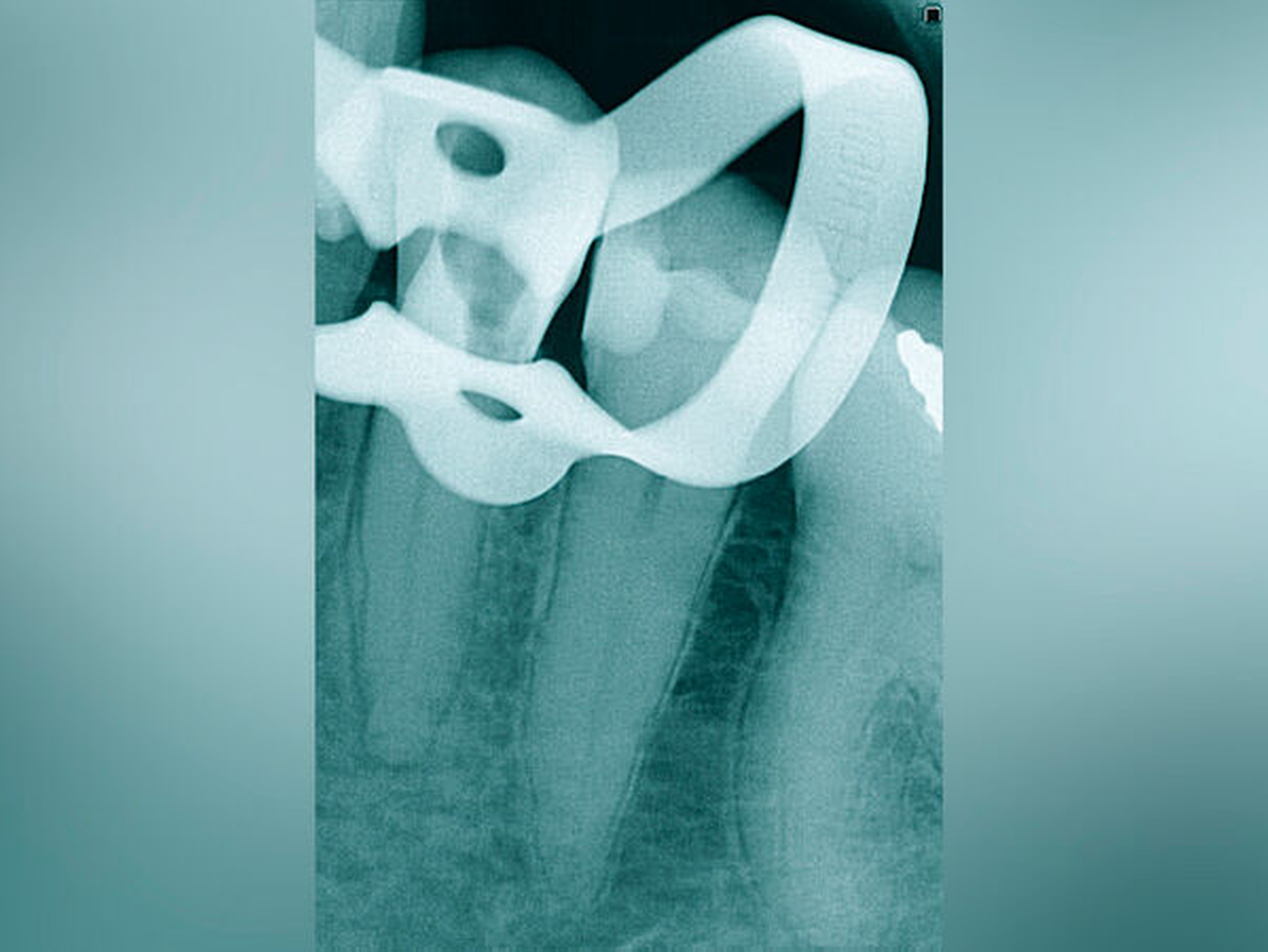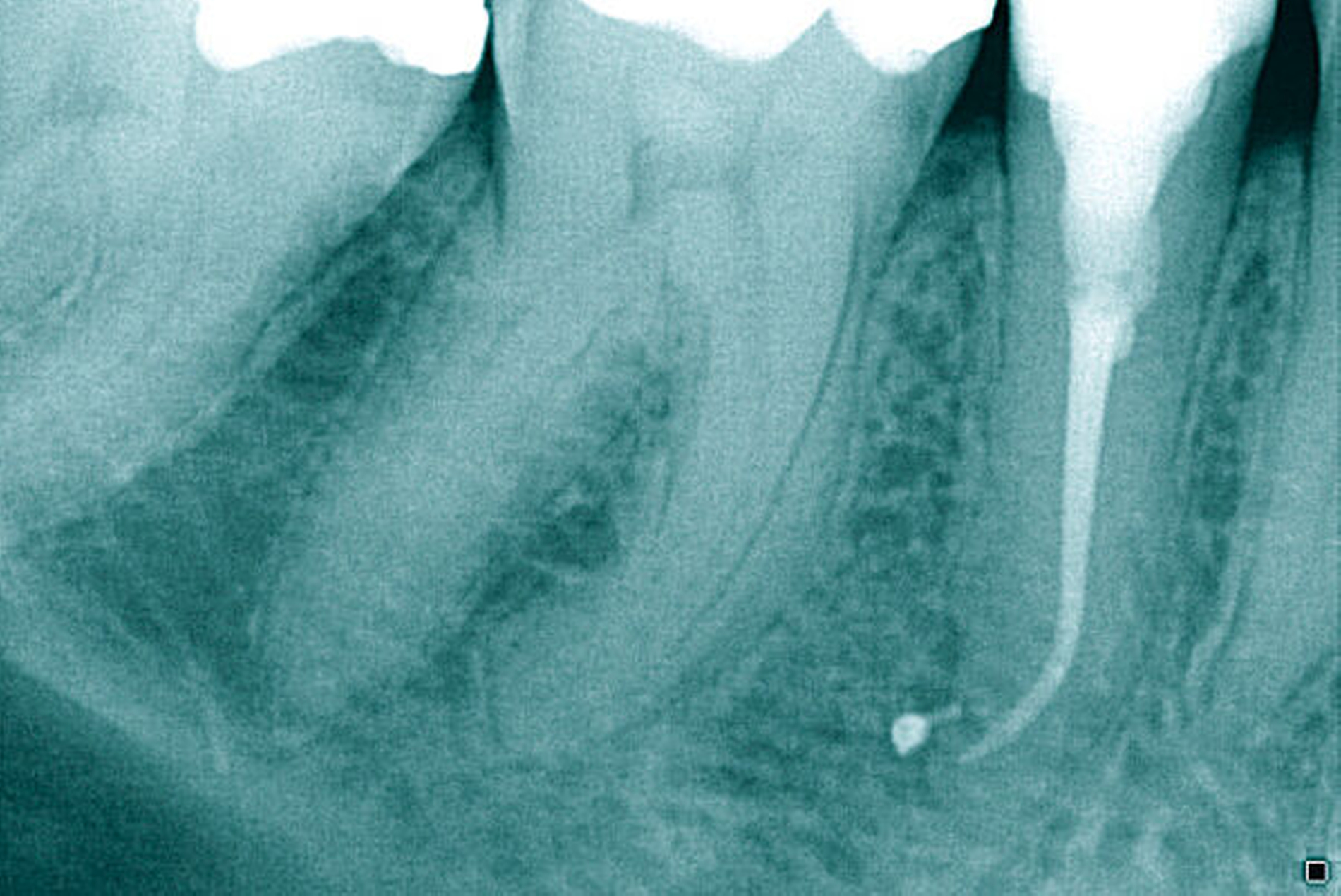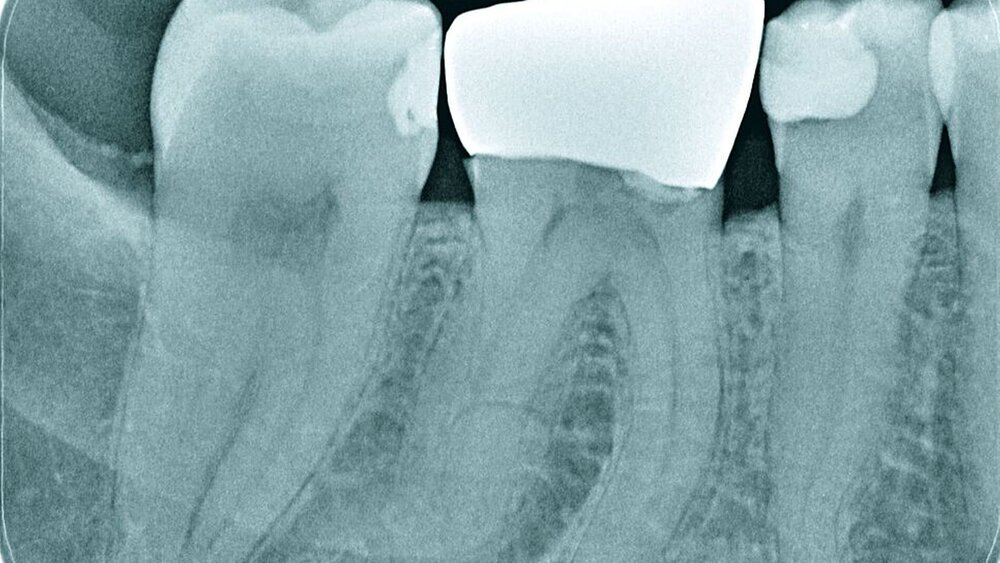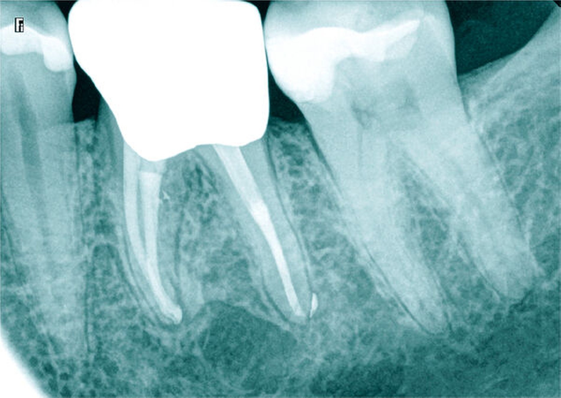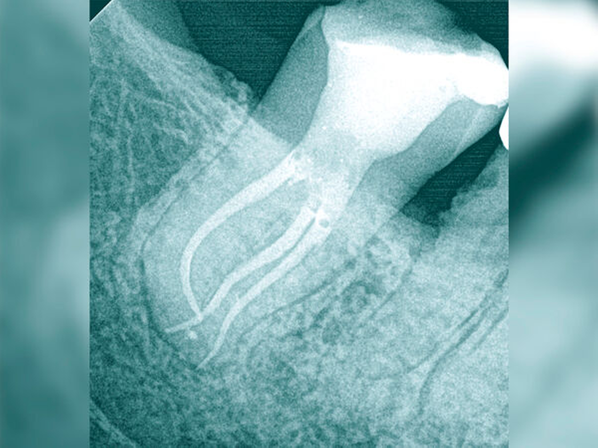 Die allgemeinmedizinisch unauffällige Patientin stellte sich mit pulpitischen Beschwerden im rechten Unterkiefer vor. Der Sensibilitätstest am Zahn 45 auf Kälte war stark positiv und reizüberdauernd. Auf den Perkussionstest reagierte der Zahn reproduzierbar verstärkt positiv. Radiologisch war ein pulpanahes, röntgendichtes Füllungsmaterial erkennbar und apikal ein verbreiterter Desmodontalspalt.