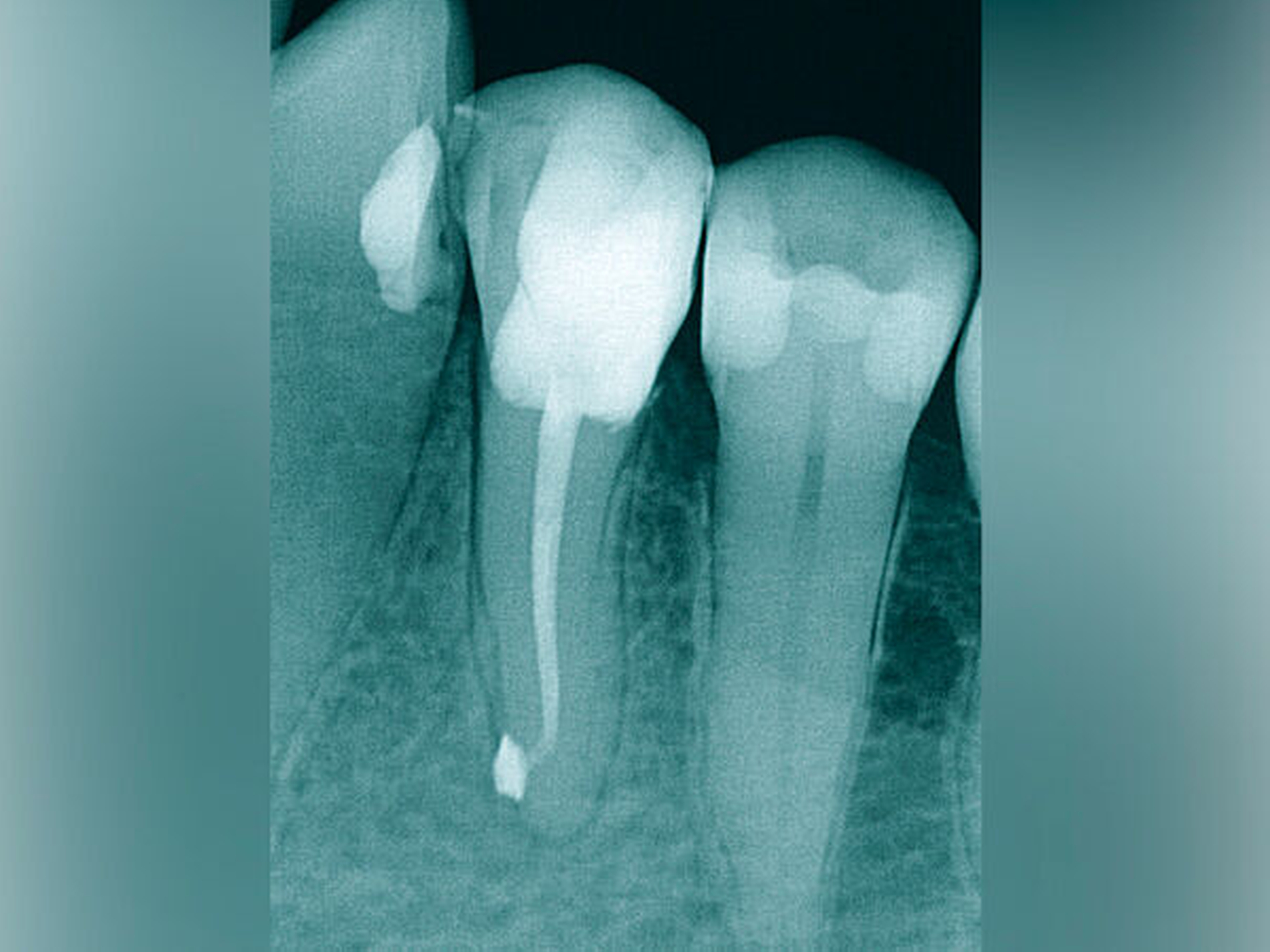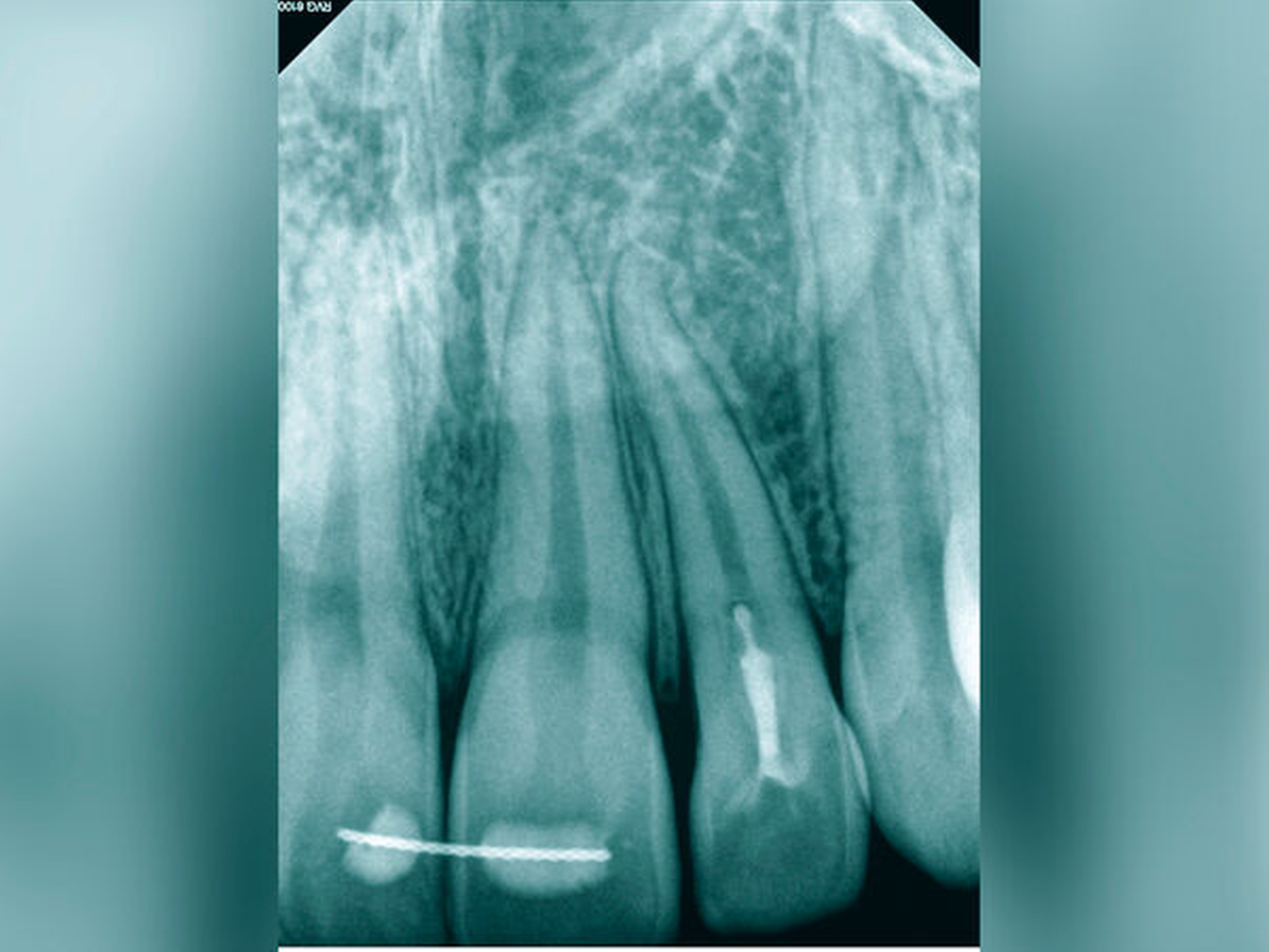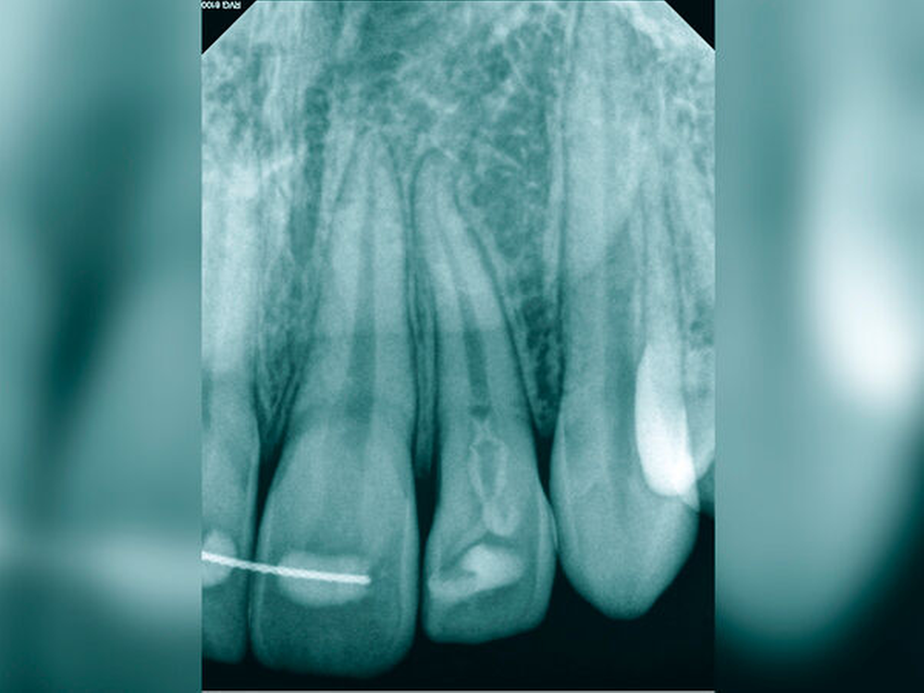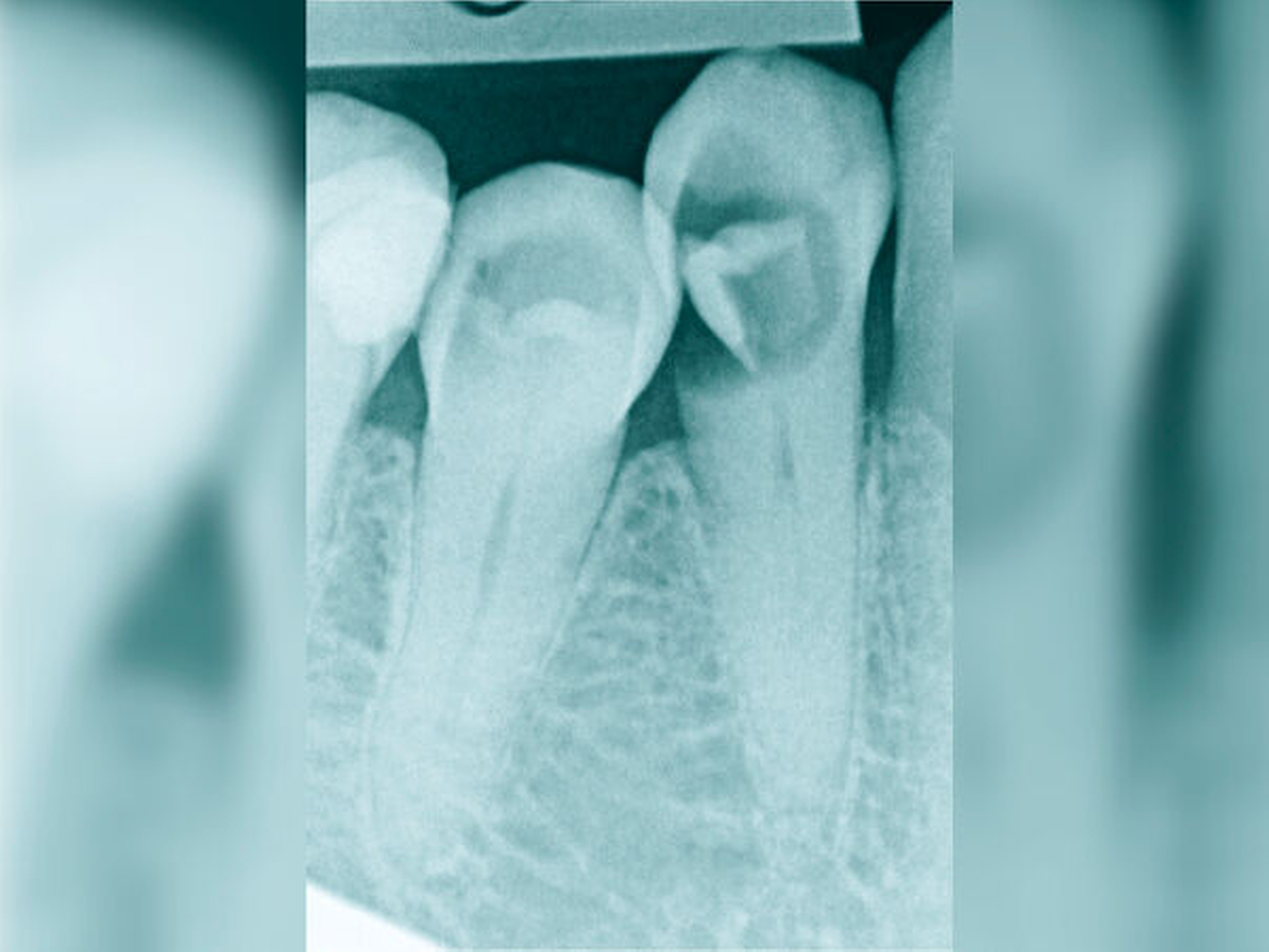 Die allgemeinmedizinisch unauffällige Patientin stellte sich mit pulpitischen Beschwerden im rechten Unterkiefer vor. Der Sensibilitätstest am Zahn 45 auf Kälte war stark positiv und reizüberdauernd. Auf den Perkussionstest reagierte der Zahn reproduzierbar verstärkt positiv. Radiologisch war ein pulpanahes, röntgendichtes Füllungsmaterial erkennbar und apikal ein verbreiterter Desmodontalspalt.