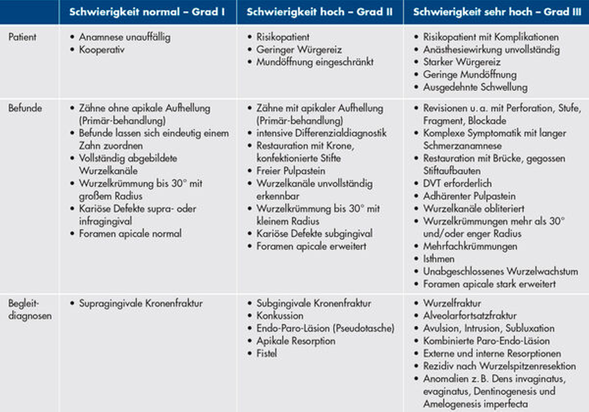 Die vorgestellte Einteilung ermöglicht eine Unterscheidung der Schwierigkeitsgrade in der endodontischen Diagnostik und Therapie. Erst mit dem Erkennen der komplexen Anforderungen eines Behandlungsfalls können die Möglichkeiten der eigenen Praxis rechtzeitig vor Behandlungsbeginn geprüft werden, so dass Misserfolge vermieden werden können (Tabelle 2).