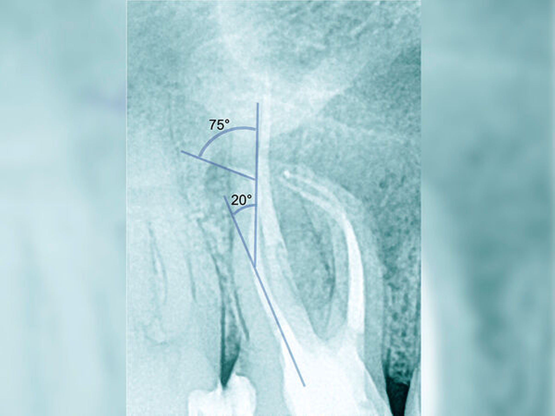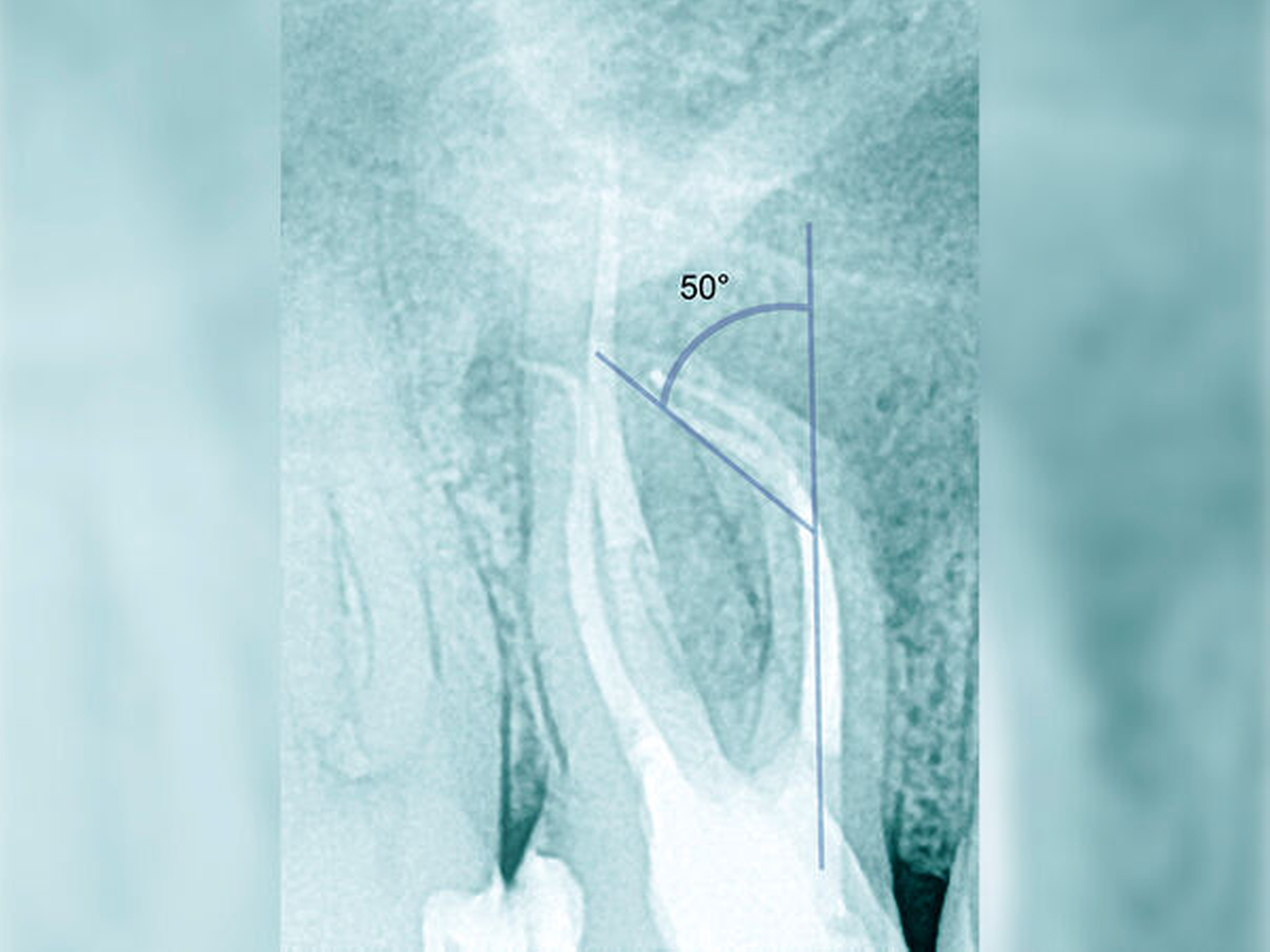Röntgenbilder können genutzt werden, den anatomischen Schwierigkeitsgrad zu ermitteln. Lässt sich ein Wurzelkanal vollständig bis zum Apex mit einem Krümmungswinkel bis zu 30 Grad und einem großen gleichmäßigen Krümmungsradius erkennen, ist keine erhöhte Schwierigkeit in der Therapie zu erwarten (Abbildungen 1 und 2).