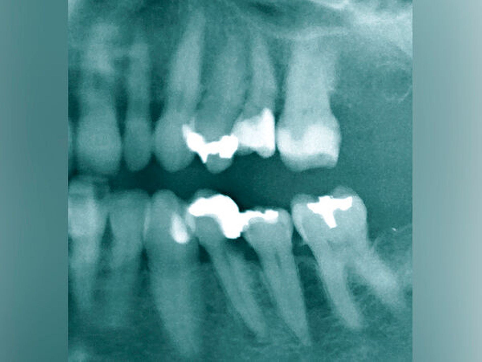 Der Patient stellte sich mit seit mehreren Tagen fortbestehenden starken Schmerzen im linken Ober- und Unterkiefer vor, die spontan auftraten und durch keinen Reiz ausgelöst werden konnten. Die Schmerzen waren nicht eindeutig einem Zahn zuzuordnen. Anamnestisch gab der Patient zusätzlich eine medikamentös eingestellte Hypertonie und Schilddrüsenunterfunktion an. Während der klinischen Inspektion und Palpation fiel eine diskrete Rötung und Schwellung Regio 34/35 auf. Der Perkussions- und Palpationsbefund für Zahn 34 war positiv. Differenzialdiagnostisch konnten die Zähne 25 und 26 mit ausgedehnten Füllungen als schmerzverursachende Zähne ausgeschlossen werden. Auf der OPG-Aufnahme war am Zahn 34 eine profunde Sekundärkaries am distalen Füllungsrand zu erkennen. Die apikale Aufhellung an Zahn 34 ließ eine infizierte Pulpanekrose vermuten (Abbildung 12).
