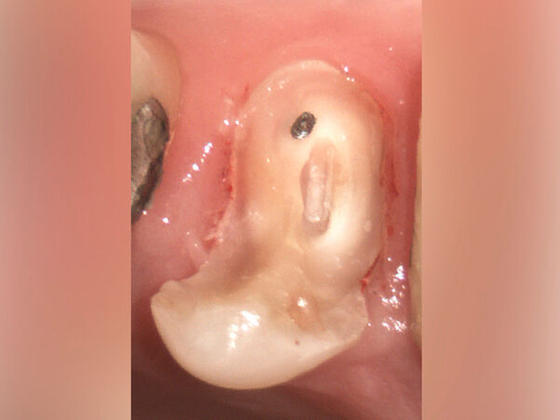 Der Patient stellte sich mit rezidivierenden Beschwerden am Zahn 45 nach einer vor Jahren abgeschlossenen Wurzelkanalbehandlung vor. Die Allgemeinanamnese war unauffällig. Die Schmerzsymptomatik ließ sich auf den Zahn 45 bei positivem Perkussionsreiz lokalisieren. Der approximale Kontaktpunkt distal zum Zahn 46 fehlte. Distal fiel ein pathologischer Sondierungswert von 4 mm auf. Eine Blutung ließ sich bei passiver Messung auslösen und begründete eine plaqueinduzierte Gingivitis.