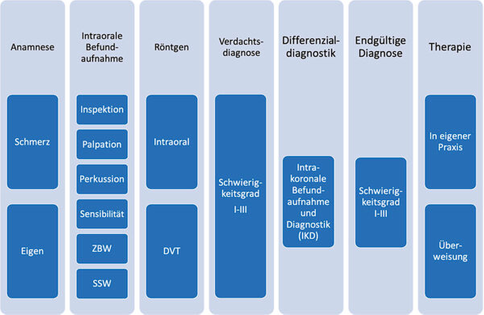 Den Erfolg einer endodontischen Therapie vorher zu bestimmen, ist von vielen Faktoren abhängig. Die Auswertung aller Befunddaten kann dazu beitragen, das Risiko eines Misserfolgs oder Therapieabbruchs im Interesse des Patienten zu vermeiden. Eine erste Beurteilung der Schwierigkeit einer Wurzelkanalbehandlung ist nach der Anamnese und intraoralen Befundaufnahme mit einer aktuellen zweidimensionalen Röntgenaufnahme möglich. In vielen Fällen ist zusätzlich eine intrakoronale und intrakanaläre Befundaufnahme und Diagnostik (IKD) mit einer optischen Vergrößerung und koaxialen Lichtzufuhr hilfreich [AAE, 2012; Arnold et al., 2013]. Eine digitale Volumentomografie kann im Einzelfall erforderlich sein, um eine Verdachtsdiagnose zu erhärten oder zu verwerfen und die Möglichkeiten zur Umsetzung der erforderlichen Therapie auf die Praxisgegebenheiten zu prüfen [Patel et al., 2019].