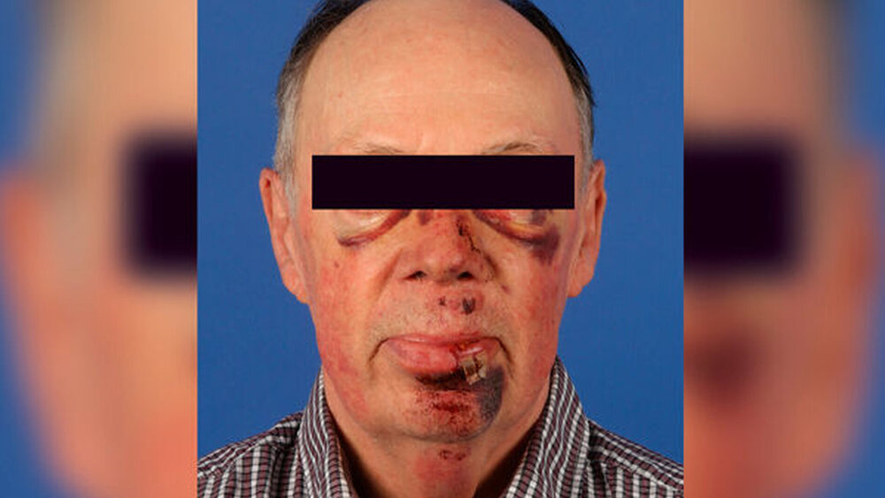 Bei Aufnahme zeigte sich der Befund eines allseits orientierten 78-jährigen Patienten in gutem Allgemeinzustand und ohne für den Akutbefund relevante Vorerkrankungen. Klinisch fanden sich Hämatome periorbital beidseits, insbesondere im Bereich des medialen Lidwinkels und eine perforierende Riss-Quetsch-Wunde im Bereich des Lippenrotes der Unterlippe links. Darüber hinaus bestanden eine Behinderung der Nasenatmung und eine starke Schwellung sowie ein ausgeprägter Druckschmerz im Bereich des Nasenrückens. An der Totalprothese des Oberkiefers fand sich eine kleine Absprengung des ersetzten Zahns 11. Der Patient gab Schmerzen im Bereich des Rückens und des Gesäßes an. Die weitere körperliche Untersuchung zeigte keine Traumafolgen.