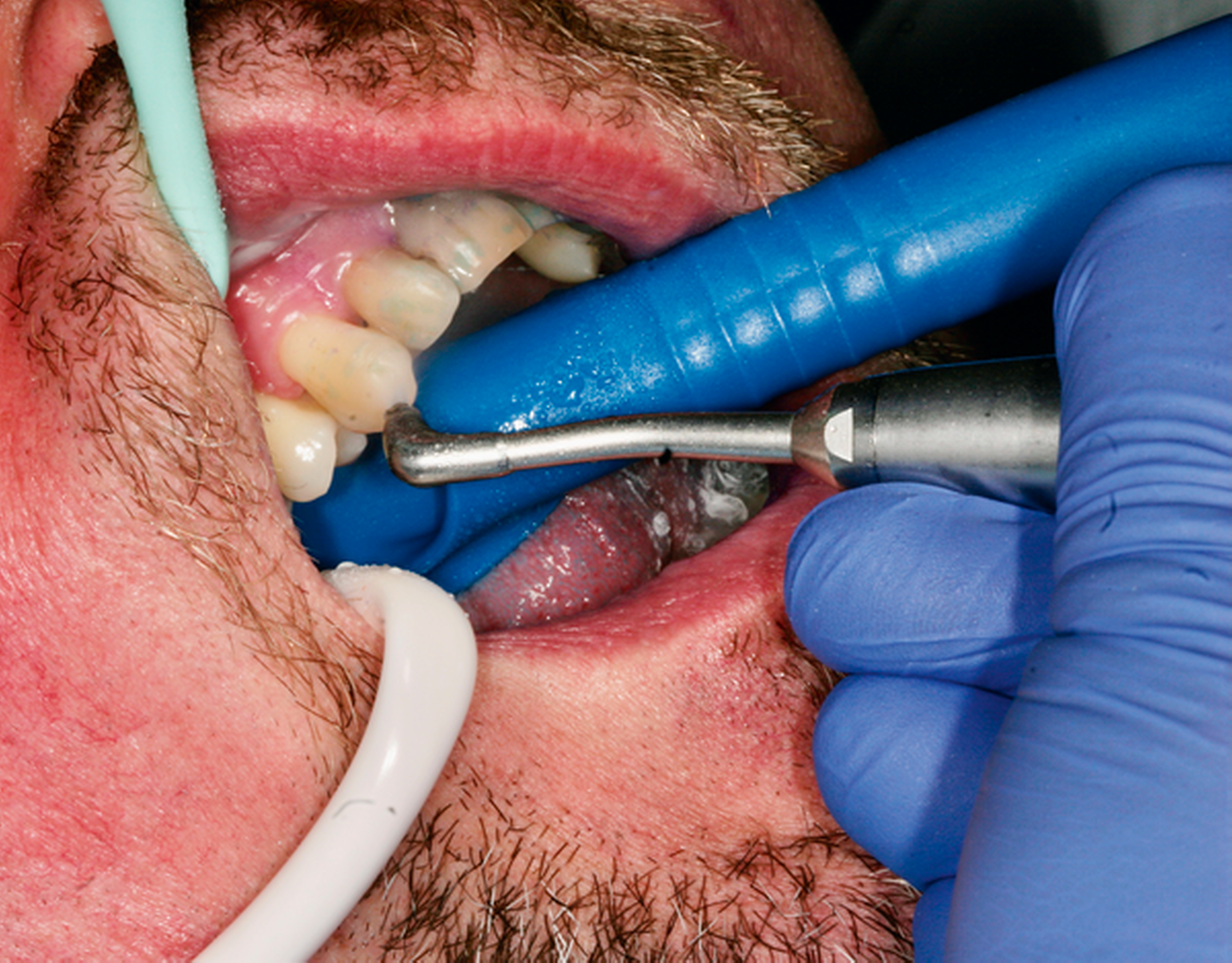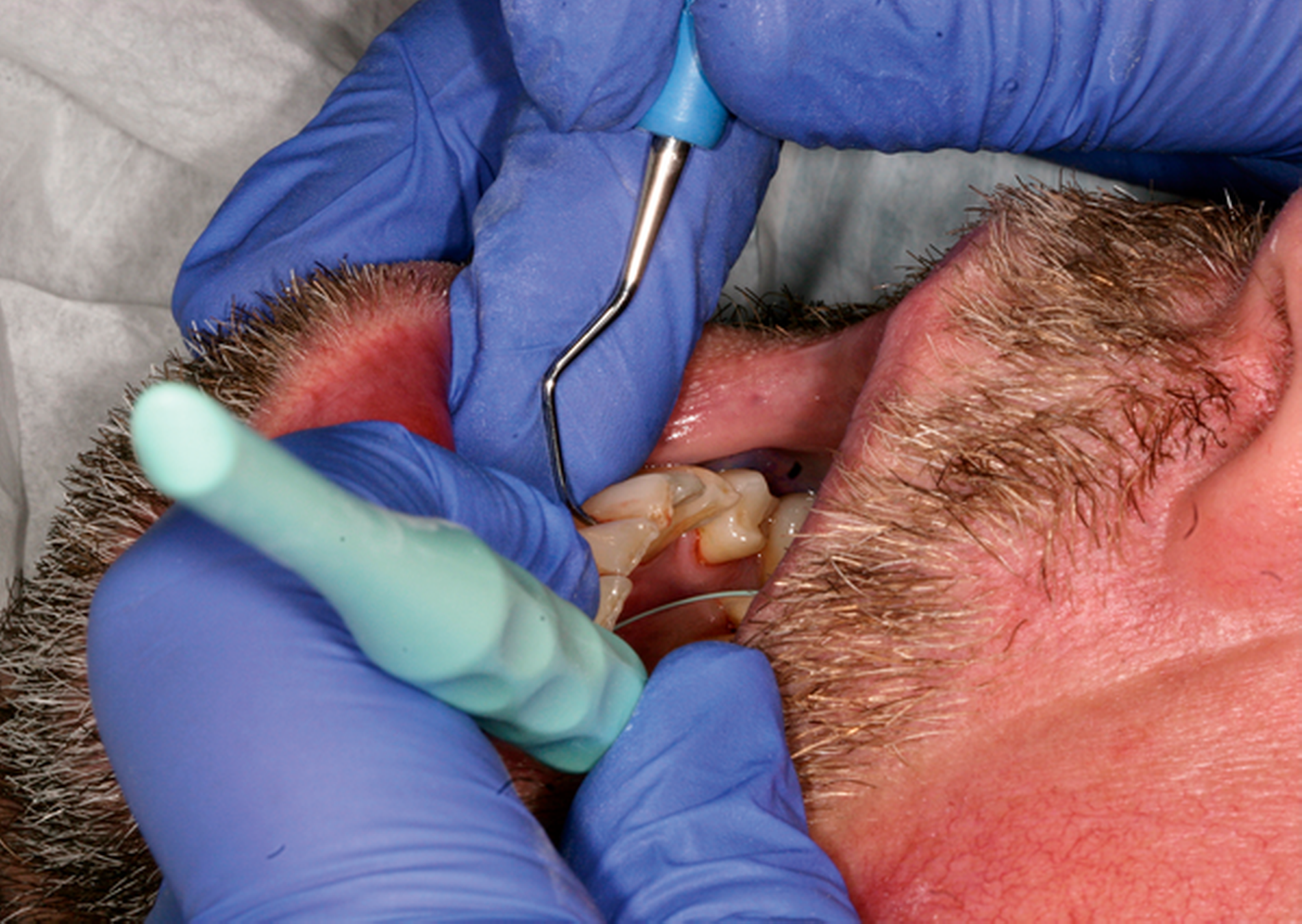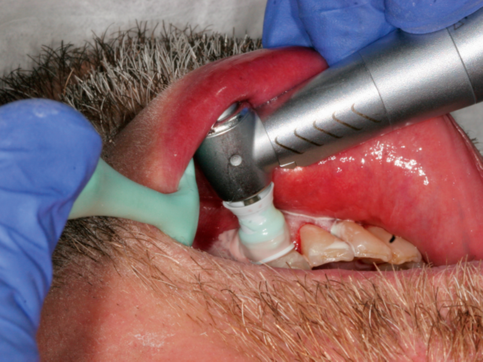 Abb. 2: Professionelle mechanische Plaquereduktion während einer UPT-Sitzung bei einem 50-jährigen Patienten mit reduziertem, aber gesundem Parodont im dritten Jahr nach zweiter Therapiestufe: