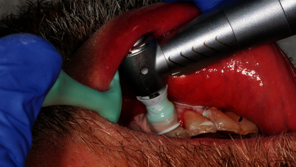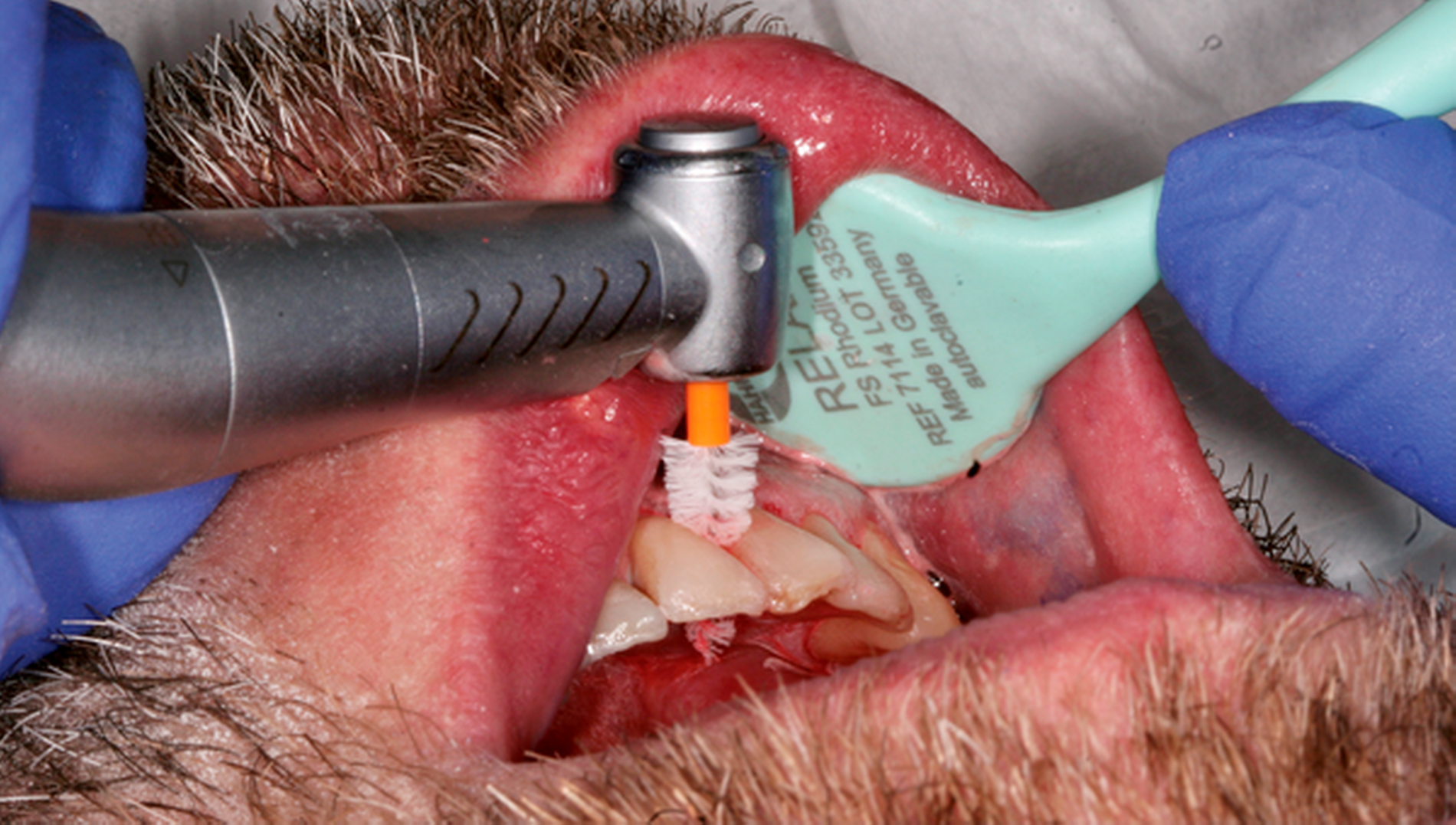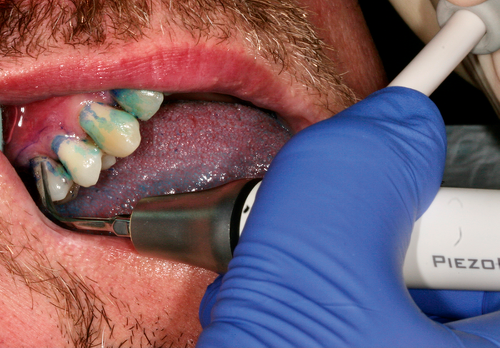 Abb. 2: Professionelle mechanische Plaquereduktion während einer UPT-Sitzung bei einem 50-jährigen Patienten mit reduziertem, aber gesundem Parodont im dritten Jahr nach zweiter Therapiestufe: