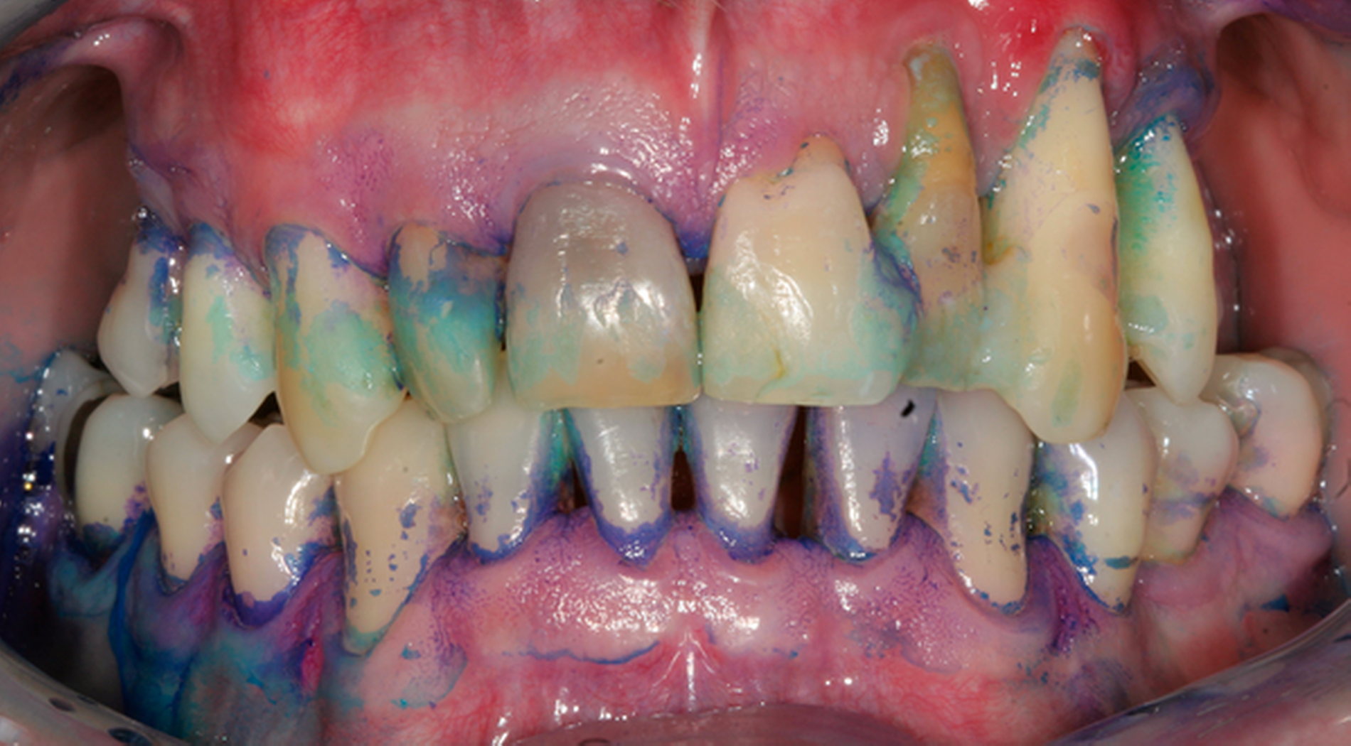 Abb. 1: Interventionen zur Instruktion und Motivation des häuslichen supragingivalen Biofilmmanagments im Rahmen einer UPT-Sitzung: Der 50-jährige Patient befindet sich im dritten Jahr nach der zweiten Therapiestufe und hat ein reduziertes, aber gesundes Parodont.