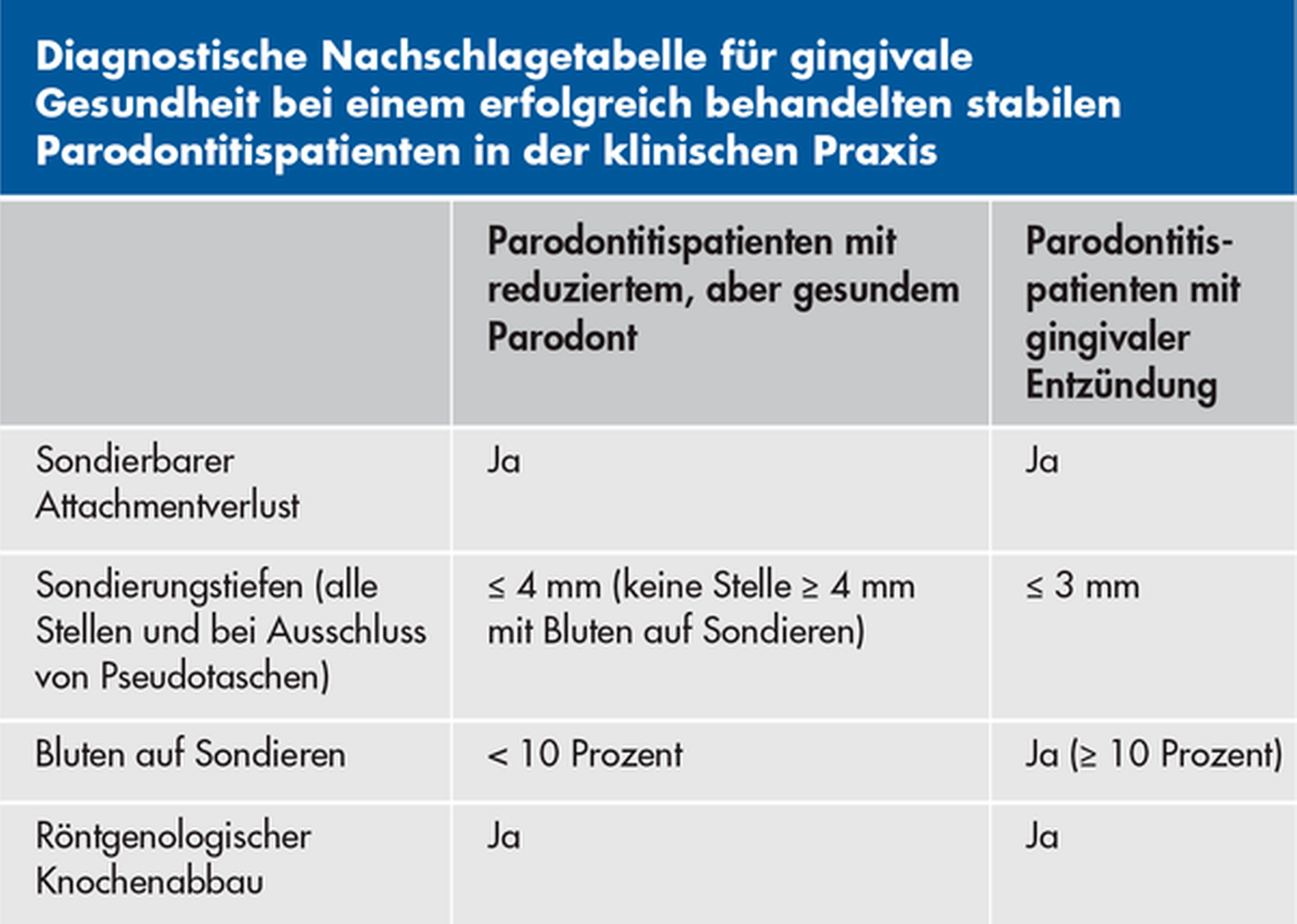 Für die nachfolgenden Empfehlungen ist zu beachten, dass die Parodontitispatienten nach Abschluss der ersten drei Therapiestufen in zwei diagnostische Gruppen unterteilt werden können (Tabelle 1):