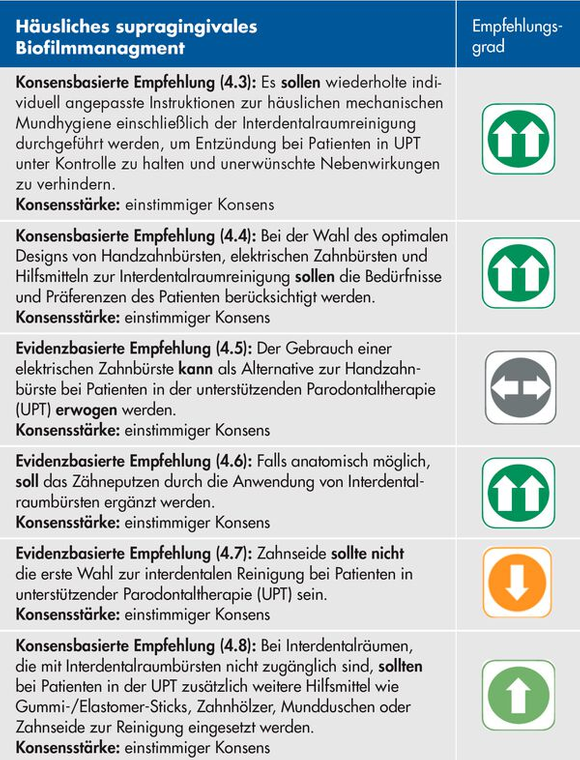 Die professionellen Interventionen benötigen ein strukturiertes Recall-System mit Besuchen von etwa 45 bis 60 Minuten, die an den Bedarf des einzelnen Patienten individuell angepasst sind. Dabei sollte beachtet werden, dass weder eine Über- noch eine Untertherapie erfolgt, weshalb die UPT-Intervalle in Abständen von drei bis maximal zwölf Monaten geplant werden sollten (Konsensbasierte Empfehlung 4.1 mit starkem Konsens der Leitliniengruppe) und fortlaufend individuell an das Risikoprofil und den parodontalen Status des Patienten angepasst werden [Polak et al., 2020; Ramseier et al., 2019; Sanz et al., 2015; Trombelli et al., 2015; Trombelli et al., 2020]. Die Empfehlung, den Patienten zur Einhaltung seiner UPT-Intervalle zu motivieren, fand ebenfalls einen starken Konsens (Konsensbasierte Empfehlung 4.2), da dies für die parodontale Langzeitstabilität und mögliche weitere Verbesserungen des parodontalen Zustands von entscheidender Bedeutung ist [Costa et al., 2014; Sanz et al., 2015; Trombelli et al., 2015]. Zusätzliche Strategien zur Motivation werden analog den entsprechenden Empfehlungen der ersten Therapiestufe eingesetzt.