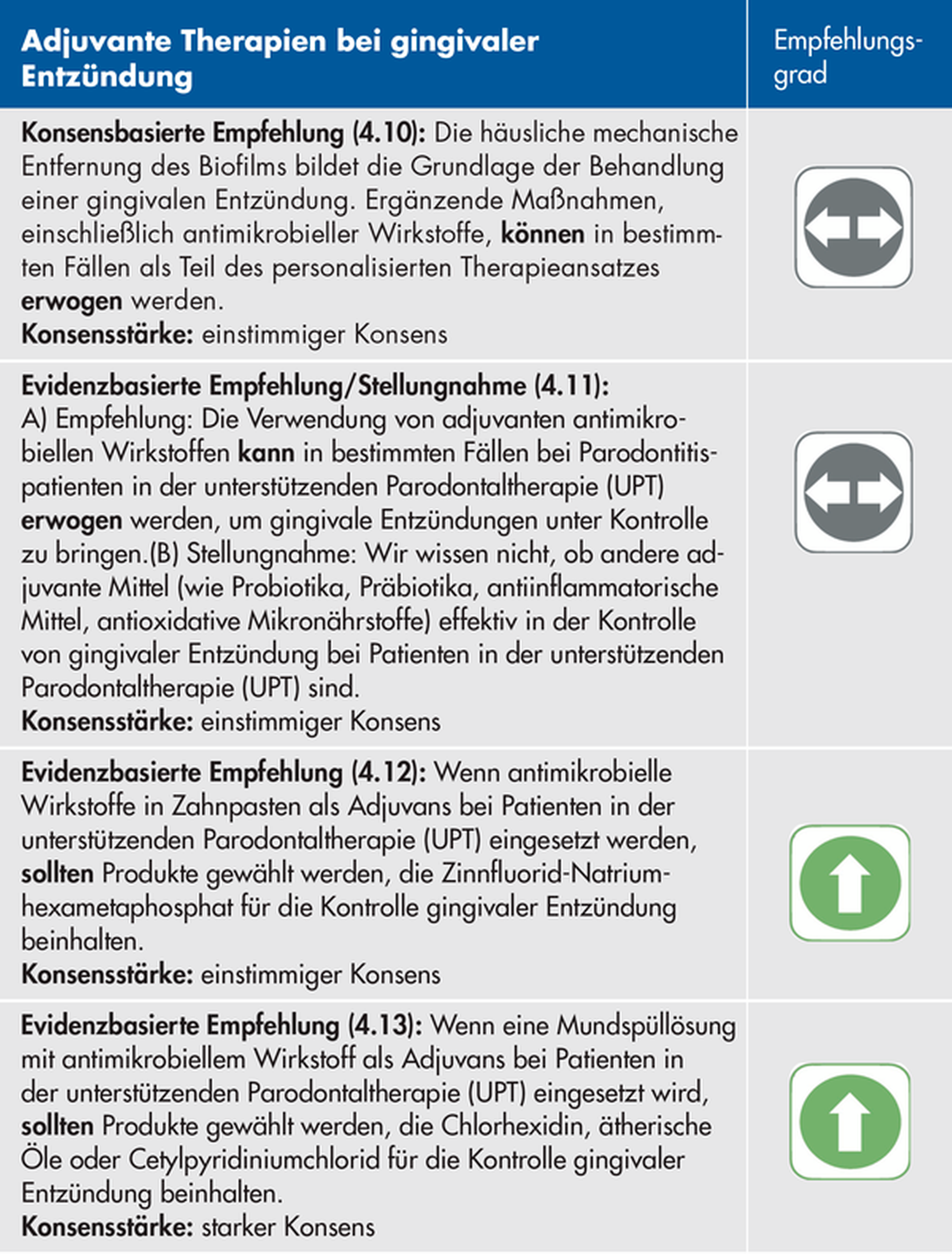 Als Teil eines personalisierten Therapieansatzes kann in bestimmten Fällen das mechanische Biofilmmanagement durch ergänzende Maßnahmen begleitet werden. Um eine gingivale Entzündung in der UPT unter Kontrolle zu halten, wurde der Gebrauch von verschiedenen Zusatzmitteln vorgeschlagen. Dazu zählen zumeist antimikrobielle Wirkstoffe in Form von Zahnpasten oder Mundspüllösungen oder in Kombination von beidem. Die begleitende Anwendung von antimikrobiellen Wirkstoffen wurde nur für die speziellen Fälle vorgeschlagen, wenn Patienten trotz intensiver Bemühungen nicht in der Lage sind, den supragingivalen Biofilm adäquat und effektiv allein durch mechanische Zahnreinigung zu entfernen.