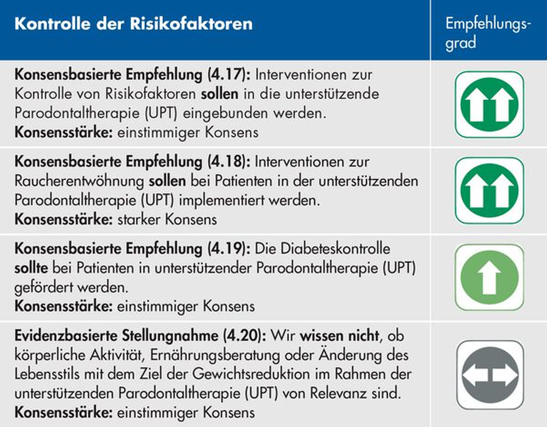 Aber wie bei vielen chronischen Entzündungserkrankungen sind es die Risikofaktoren, die in der Mehrzahl eine aktive Beteiligung der betroffenen Patienten erfordern, um langfristig die Therapieerfolge zu sichern. Daher müssen diese auch die Grundlage für eine individuell gestaltete (risikoadaptierte) Therapiestufe 4, die sogenannte unterstützende Parodontaltherapie (UPT), sein. Vor Beginn der Therapiestufe 4 muss im Rahmen einer abschließenden Beurteilung der vorhergehenden Therapiestufen festgestellt werden, ob und inwieweit die Therapieziele erreicht wurden.