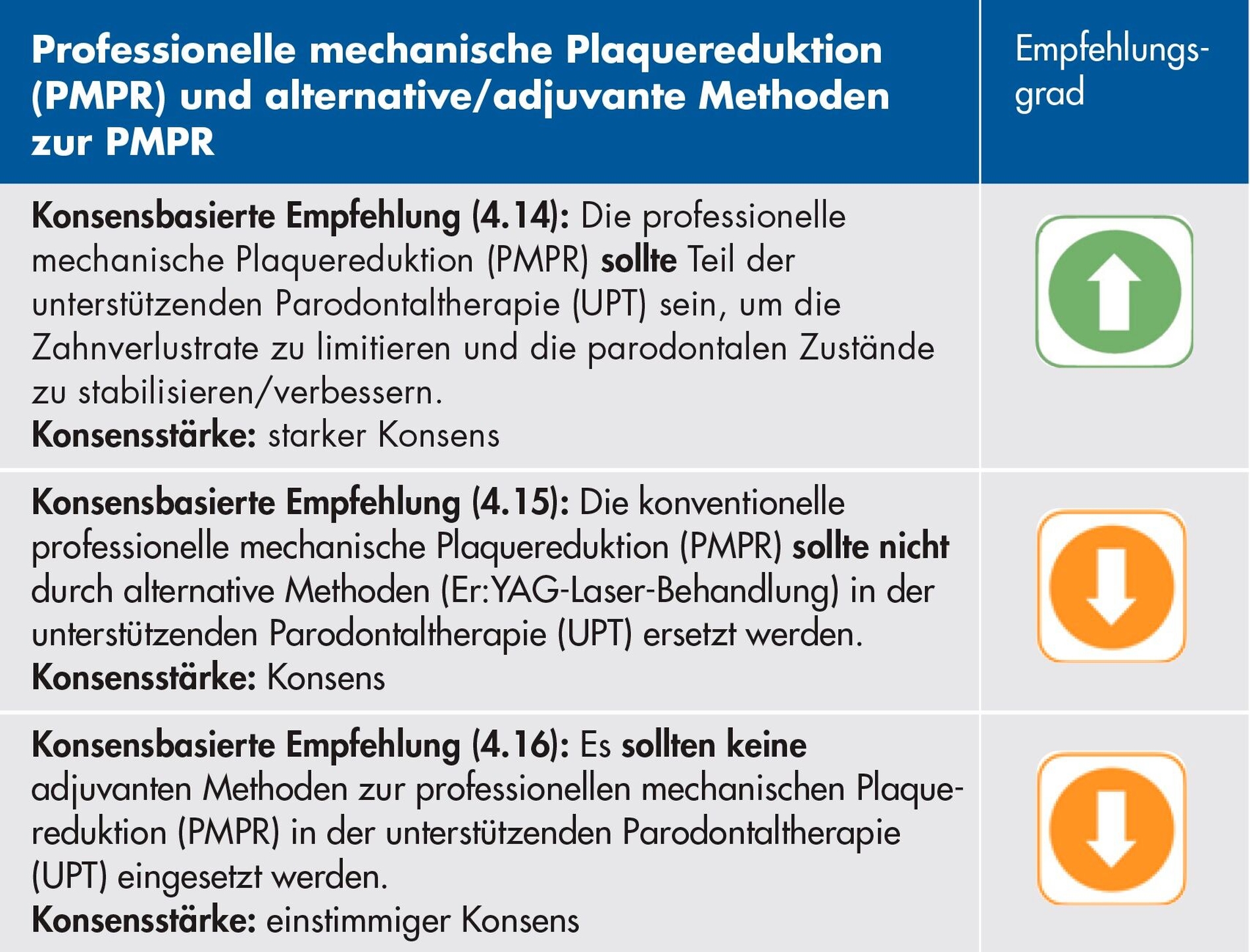 Weiterhin sollte bei der Betrachtung der Empfehlungen zu adjuvanten Maßnahmen zur PMPR – wie der antimikrobiellen Photodynamischen Therapie (aPDT) oder alternativer Verfahren wie der Er:Yag-Laseranwendung – beachtet werden, dass sich in der zugrunde liegenden systematischen Analyse von klinischen Studien von Trombelli et al. für diese Verfahren keine größeren klinischen Effekte nachweisen ließen [Trombelli et al., 2020].