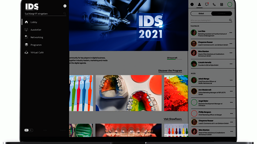 Auf der Hauptbühne („Main stage“) sollen sich die offizielle Eröffnung der Messe und die Beiträge von Verbänden am Bildschirm miterleben lassen – wie etwa das zentrale Event der Bundeszahnärztekammer, von der Initiative proDente (zum Beispiel Journalistenpreis 2021) oder von zahnärztlichen Hilfsorganisationen.