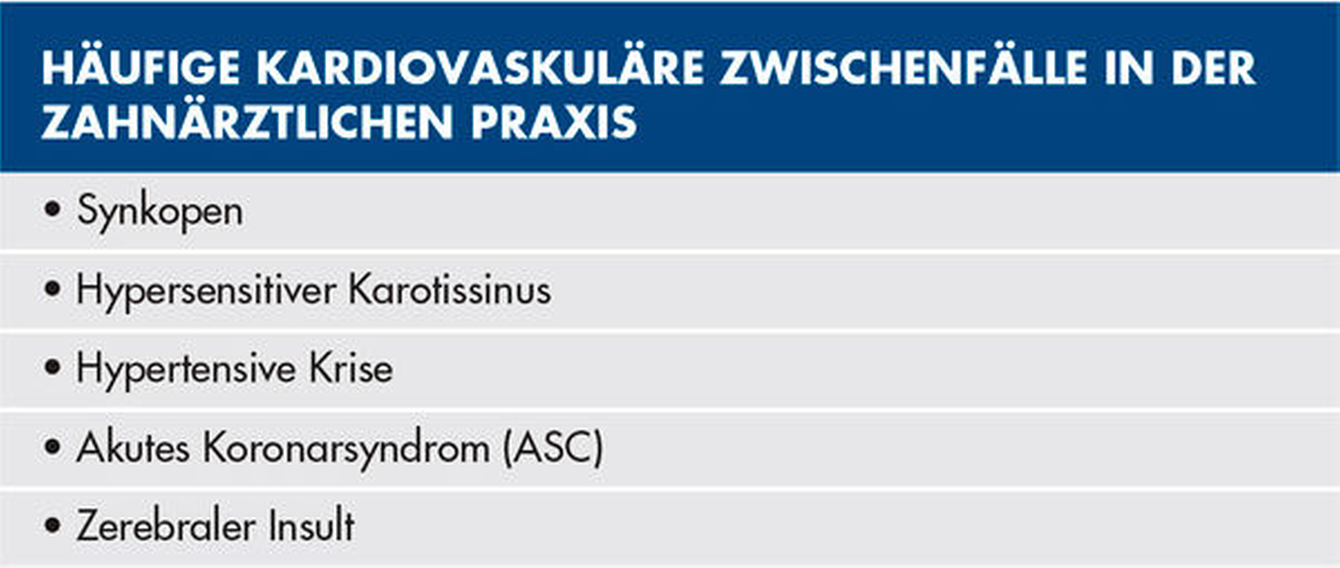 Bei jeder zahnärztlichen Behandlung muss mit Zwischenfällen gerechnet werden. Nach einer japanischen Studie aus den Jahren 1980 bis 1984 [Matsuura, 1989] blieben mit einem Anteil von 90 Prozent die meisten davon harmlos, lediglich acht Prozent waren ernsthafter Natur. Eine kardiale Vorerkrankung konnte bei 33 Prozent der Fälle nachgewiesen werden. Ein plötzliches Unwohlsein oder ein Bewusstseinsverlust (Synkope) kann die Folge einer kurzzeitigen Unterbrechung des Blutflusses zum Gehirn oder Ausdruck einer schweren Herzerkrankung (kardiale Synkope) sein. Für einen Zahnarzt ist es oft schwierig, harmlose Zwischenfälle von kritischen Situationen zu unterscheiden und umgehend die erforderlichen Maßnahmen einzuleiten. Im Folgenden werden die hauptsächlichen Herz-Kreislauf-bedingten Ereignisse, die während einer zahnärztlichen Behandlung auftreten können, beschrieben (Tabelle).