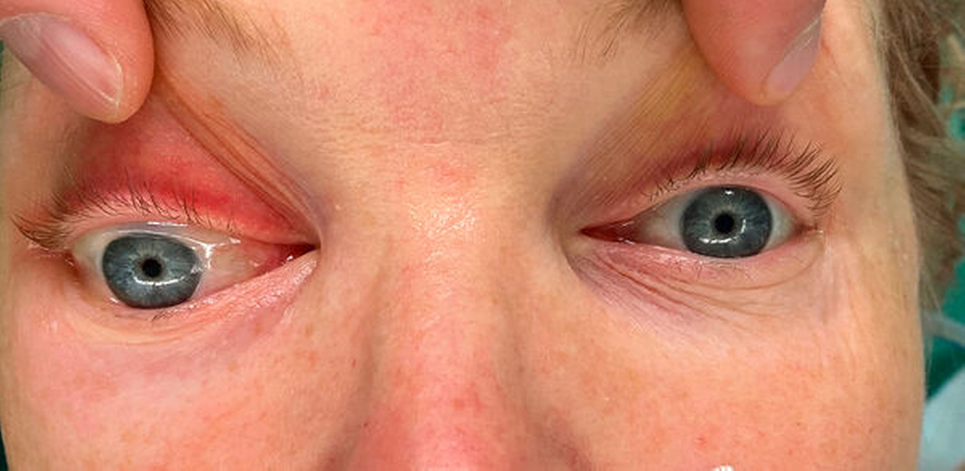 Im Laufe des Folgetages berichtete die Patientin über ein progredientes Druckgefühl im Bereich der rechten Orbita. Eine erneute Inspektion zeigte einen Exophthalmus (Abbildung 2) sowie eine Motilitätsstörung des rechten Auges beim Blick nach oben. Eine erneute Computertomografie zeigte ein in der Größe deutlich zunehmendes Hämatom im Bereich des rechten Orbitadachs mit einer Verdrängung des Musculus rectus superior nach kaudal (Abbildung 3). Nun bestand die notfallmäßige Indikation zur chirurgischen Intervention mittels chirurgischer Dekompression.