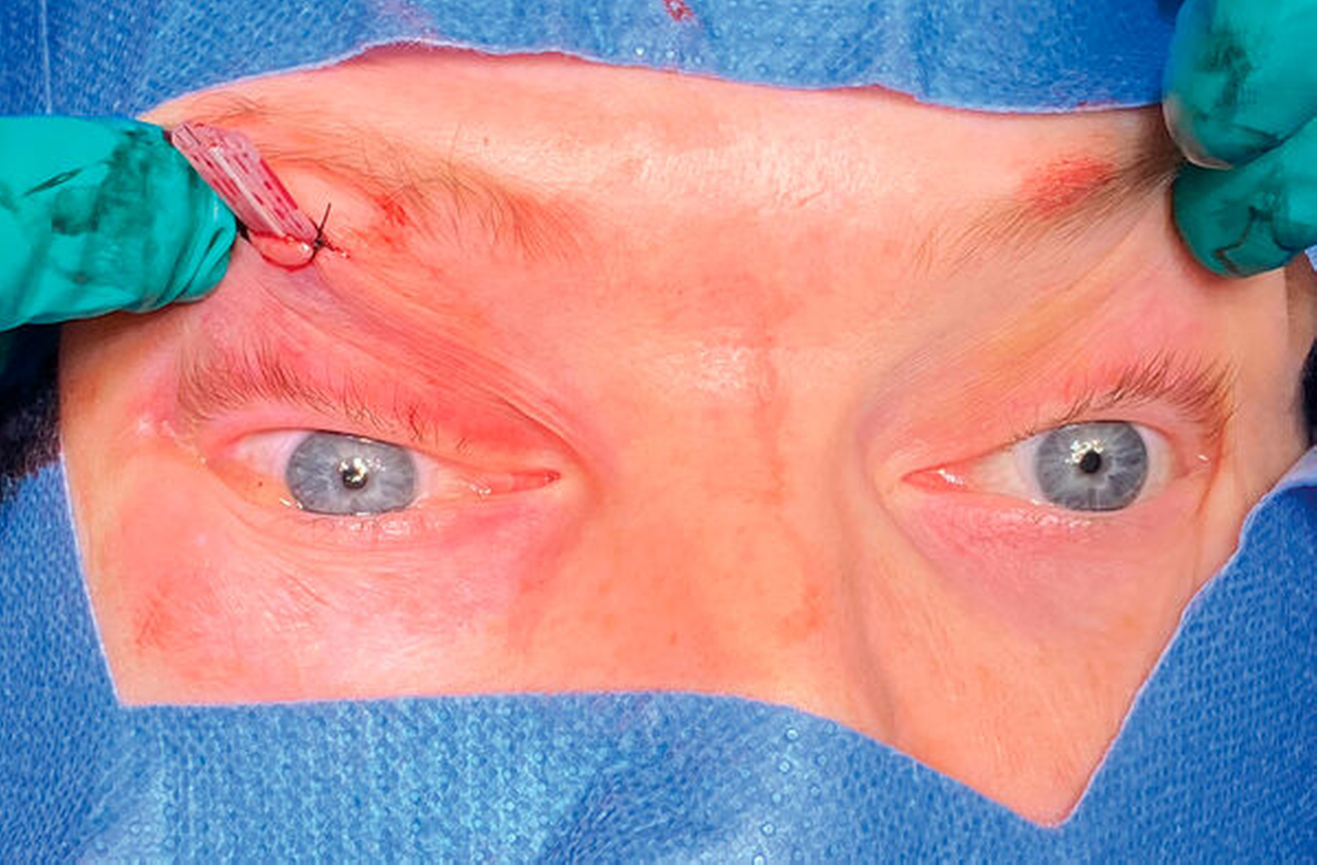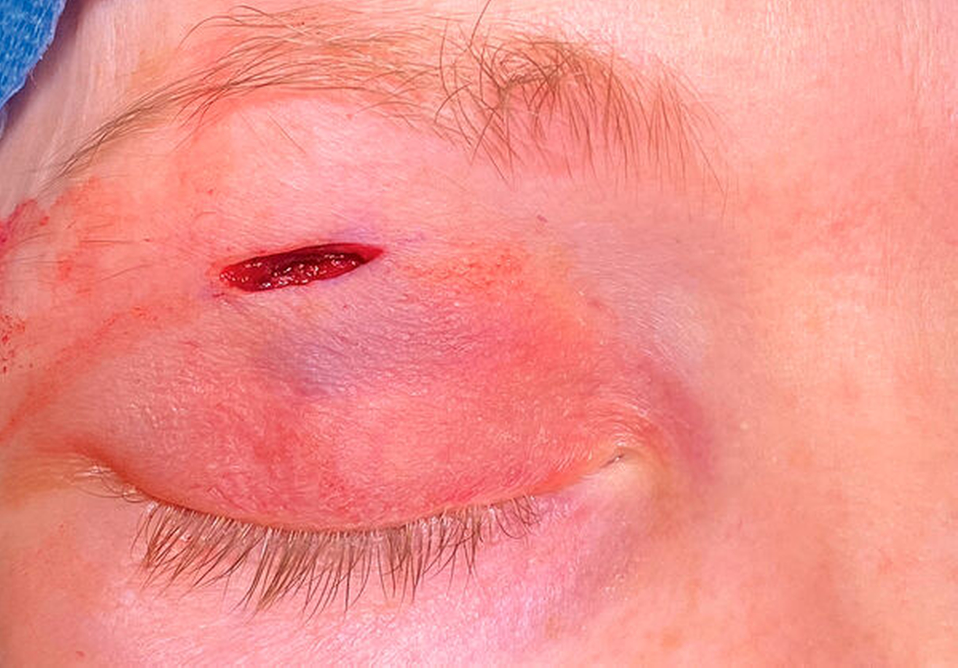 Nach ausführlicher Aufklärung der Patientin wurde der Eingriff kurze Zeit später notfallmäßig durchgeführt. Hierbei erfolgte der Zugang zur Orbita transpalpebral im Oberlid im Bereich der natürlichen Lidfalte (Abbildung 4). Nach vorsichtiger stumpfer Präparation auf den Orbitarand konnte das Hämatom nach weiterer subperiostaler Präparation im Bereich des Orbitadachs entlastet werden (Abbildung 5). Bereits unmittelbar nach der initialen Entlastung zeigte sich eine Regredienz des Exophthalmus. Zur Sicherstellung der Dekompression wurde eine Silikondrainage eingeführt und fixiert (Abbildung 6).