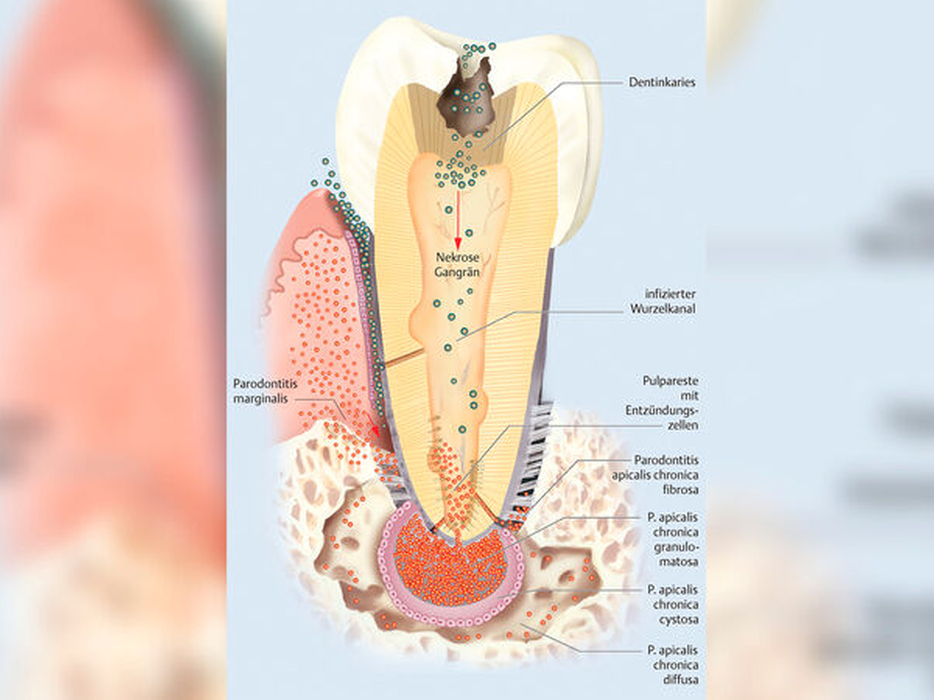 Die Entzündung verläuft an komplexen Gewebeverbänden mit Zement, Knochen und Periodontalligament mesenchymaler Herkunft und Pulpa und Dentin ektomesenchymaler Herkunft aus der Neuralleiste. Diese völlig unterschiedlichen Zellen im Entzündungsfokus finden sich an keinem anderen Organ. Deshalb ist die zelluläre Wirtsreaktion auch so vielgestaltig, wobei Resorption und Apposition von Zement und Knochen im Vordergrund stehen, gefolgt von Degeneration und Regeneration vieler beteiligter Zellen. Aber eine vollständige Heilung bleibt für immer ausgeschlossen, weil einer Zelllinie, den ektomesenchymalen primären Odontoblasten, die Regeneration verwehrt bleibt. Die Entzündungsformen werden von der Immunreaktion und den Mediatoren wie Peptiden, Prostaglandinen und Zytokinen beeinflusst.